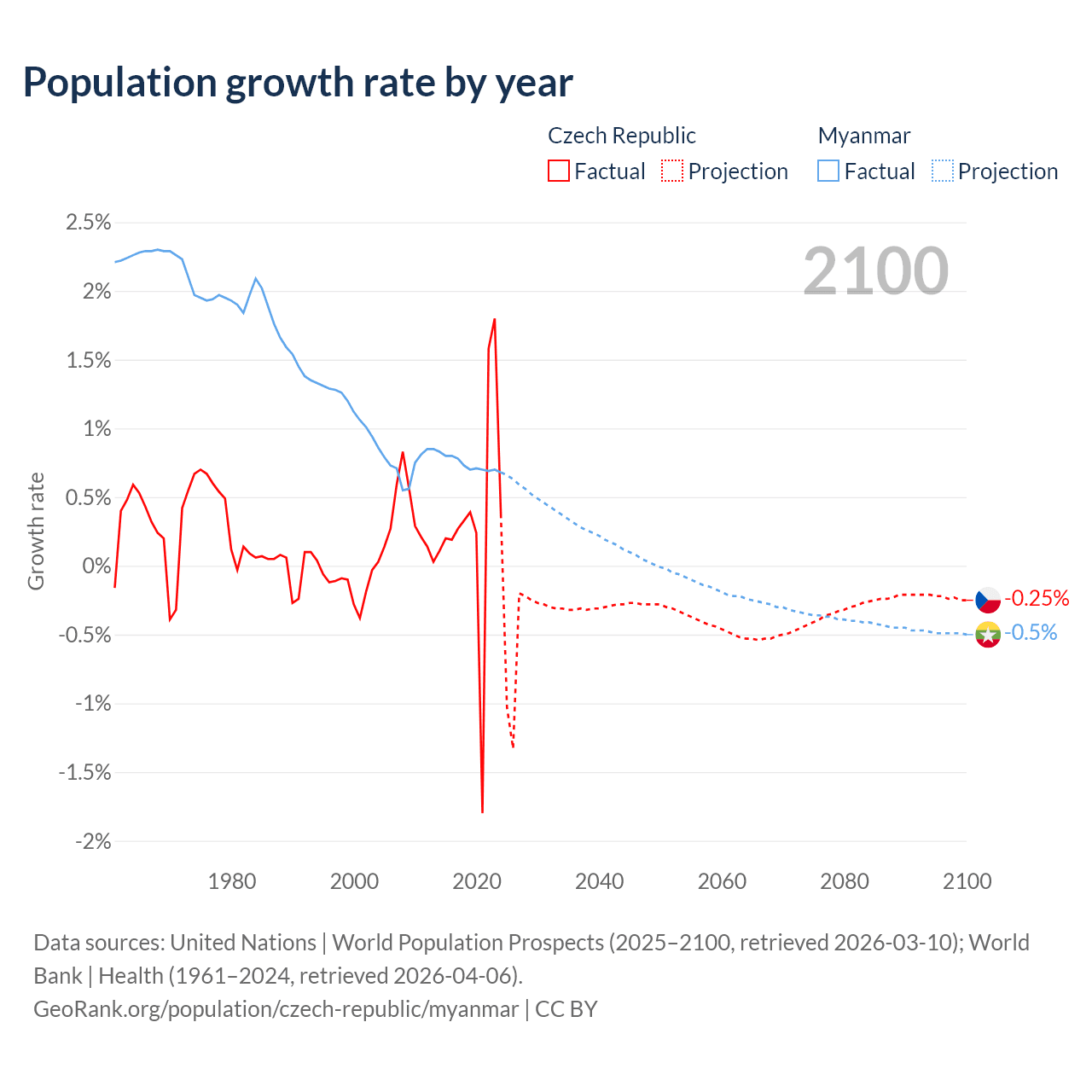 - For the last 10 years, the Czech Republic has had an average growth rate of +0.34% per year vs +0.74% in Myanmar.