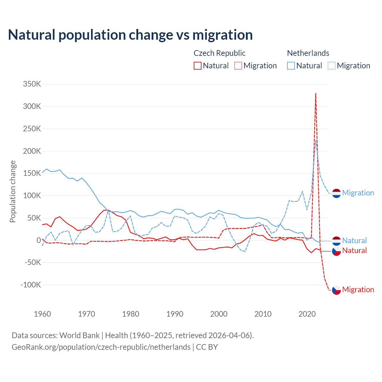Over the last 10 years, 17.3% of the population change in the Czech Republic is from natural causes (a loss of 74,826 people) and 82.7% is from migration (a gain of 357,502 people). In the Netherlands 11.8% is from natural causes (a gain of 134,554 people) and 88.2% is from migration (a gain of 1,006,495 people).