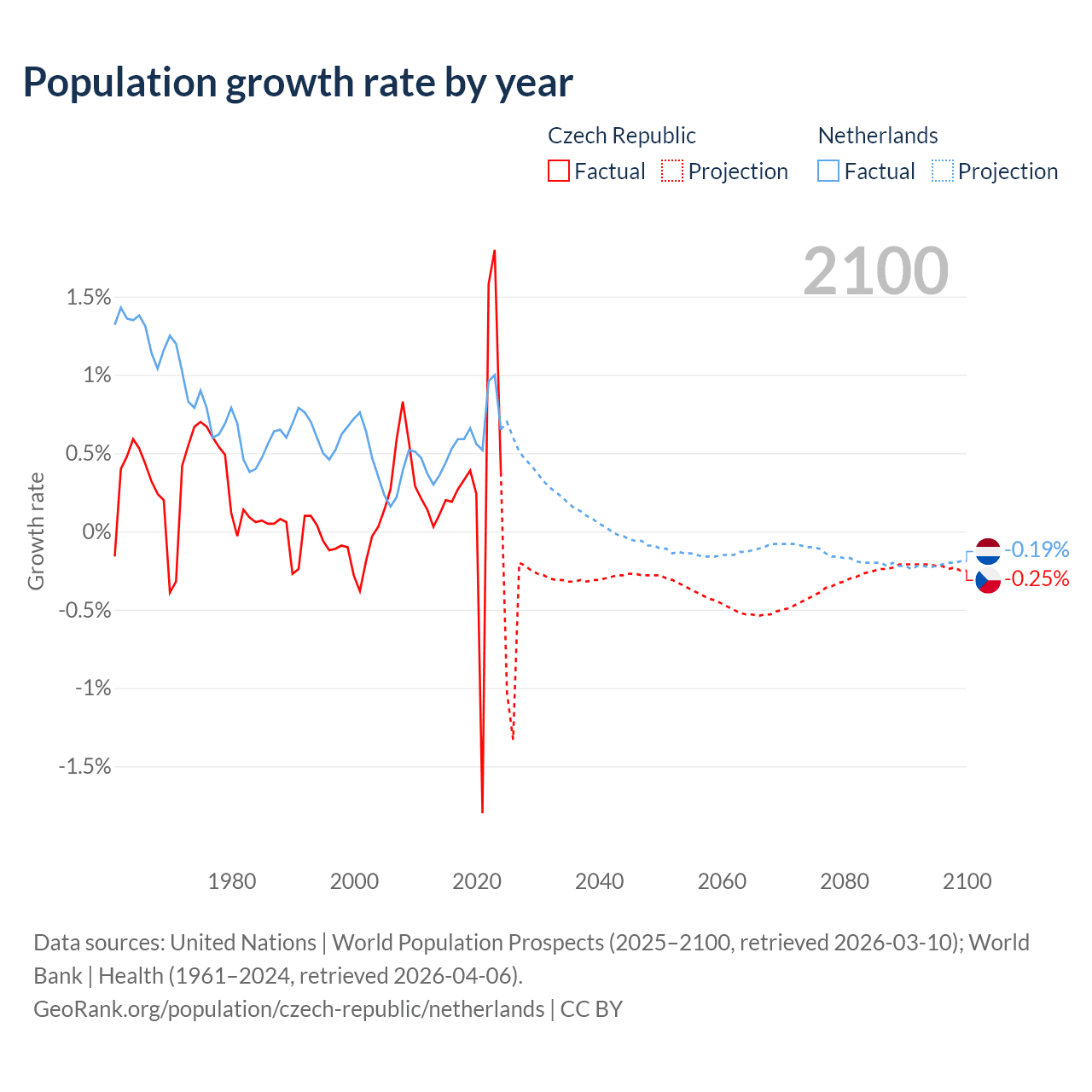 - For the last 10 years, the Czech Republic has had an average growth rate of +0.34% per year vs +0.62% in the Netherlands.