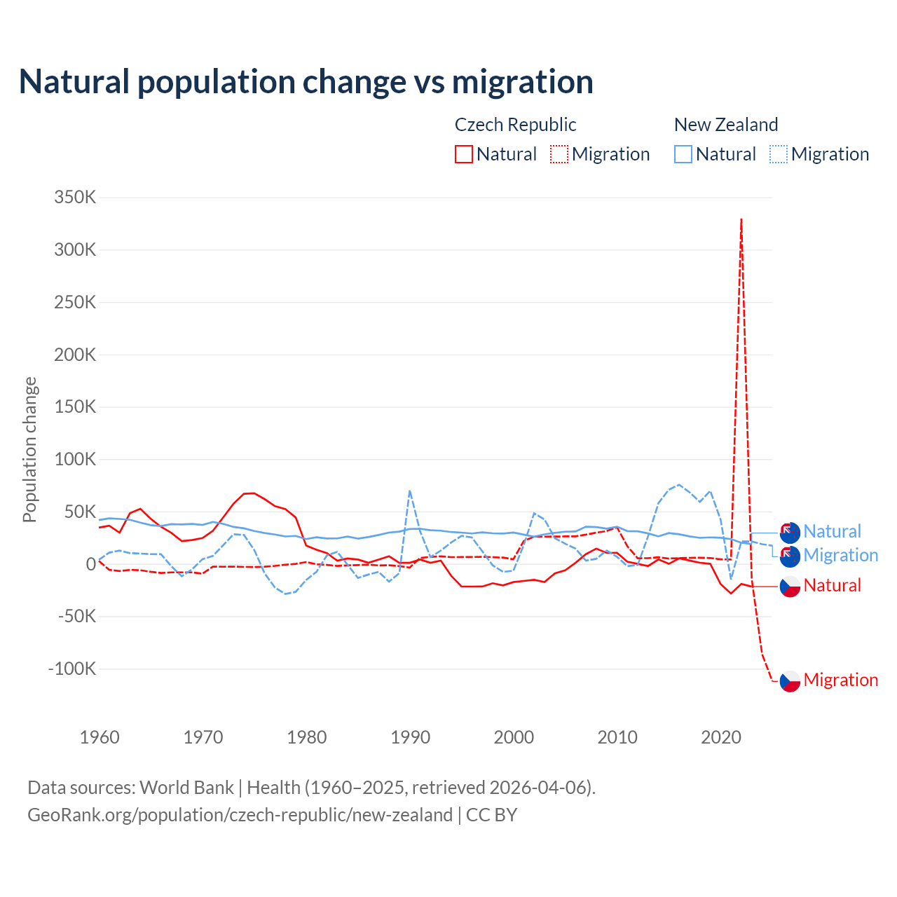 Over the last 10 years, 17.3% of the population change in the Czech Republic is from natural causes (a loss of 74,826 people) and 82.7% is from migration (a gain of 357,502 people). In New Zealand 34.4% is from natural causes (a gain of 247,767 people) and 65.6% is from migration (a gain of 471,602 people).