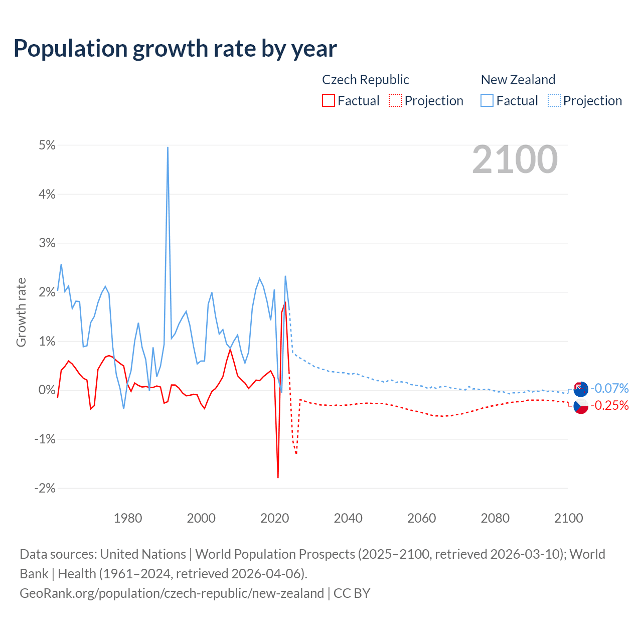 Czech Republic vs New Zealand: population by year and forecast