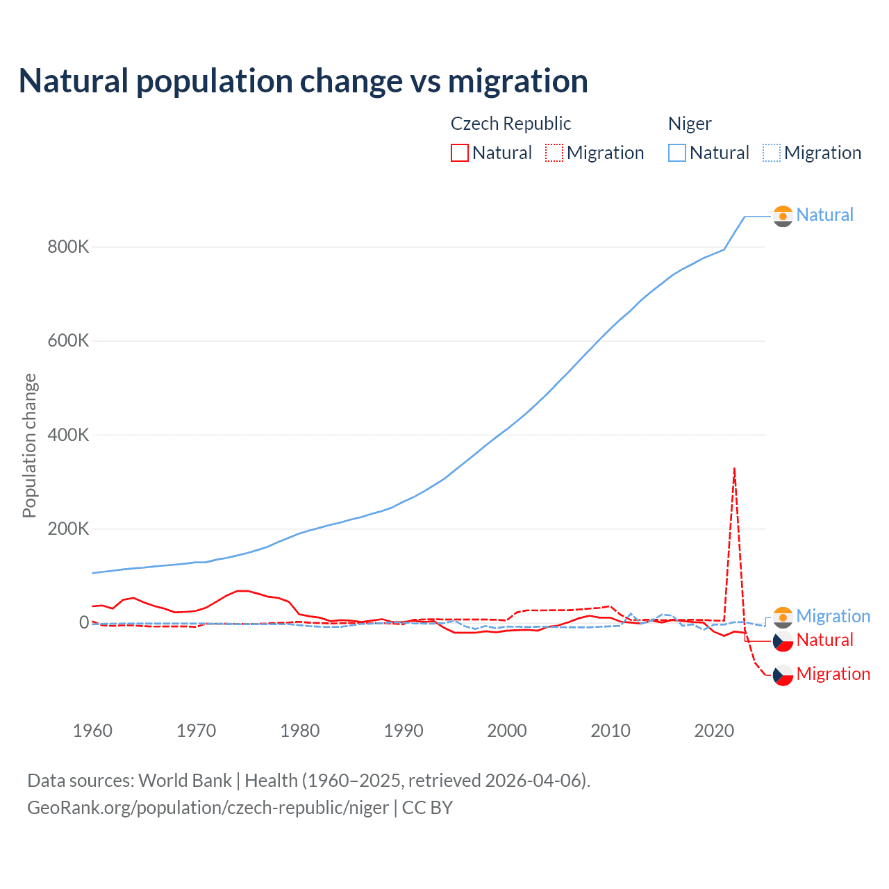 Over the last 10 years, 17.3% of the population change in the Czech Republic is from natural causes (a loss of 74,826 people) and 82.7% is from migration (a gain of 357,502 people). In Niger 100% is from natural causes (a gain of 7,728,287 people) and 0.03% is from migration (a gain of 2,520 people).