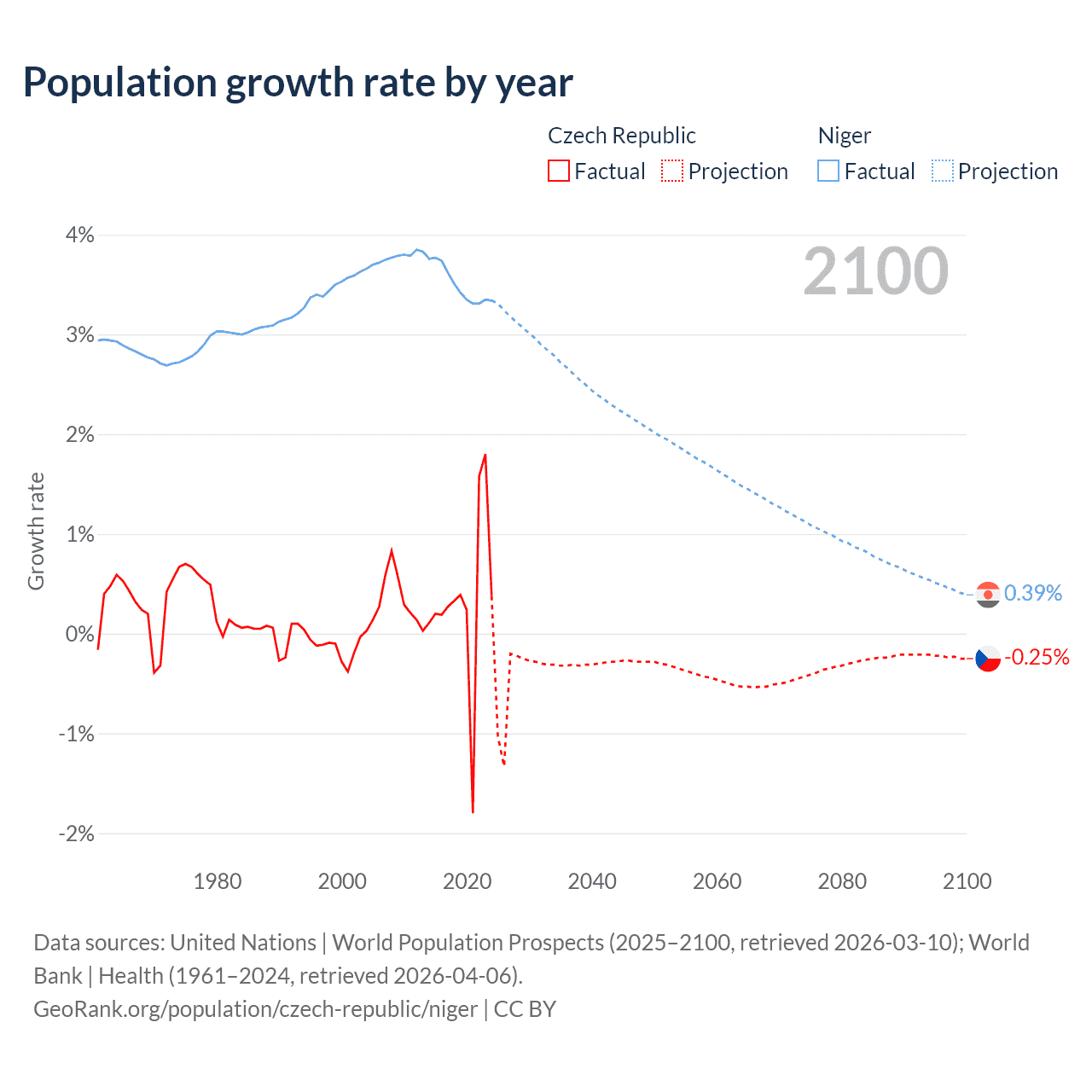 - For the last 10 years, the Czech Republic has had an average growth rate of +0.34% per year vs +3.5% in Niger.