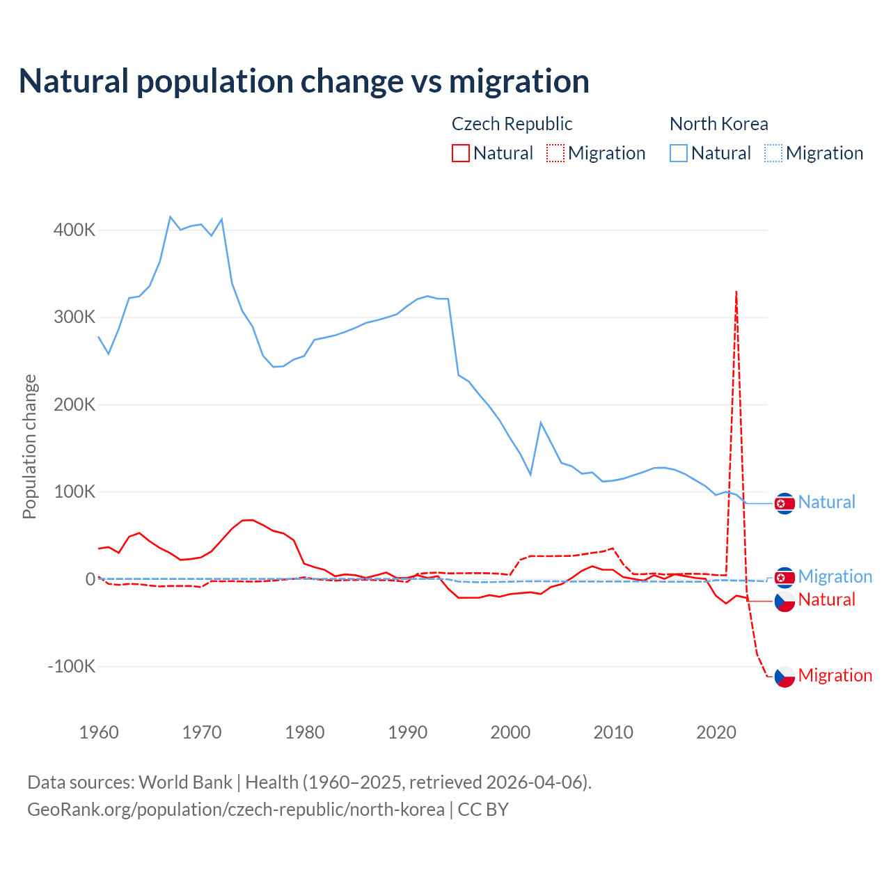 Over the last 10 years, 17.3% of the population change in the Czech Republic is from natural causes (a loss of 74,826 people) and 82.7% is from migration (a gain of 357,502 people). In North Korea 97.7% is from natural causes (a gain of 1,097,372 people) and 2.33% is from migration (a loss of 26,227 people).