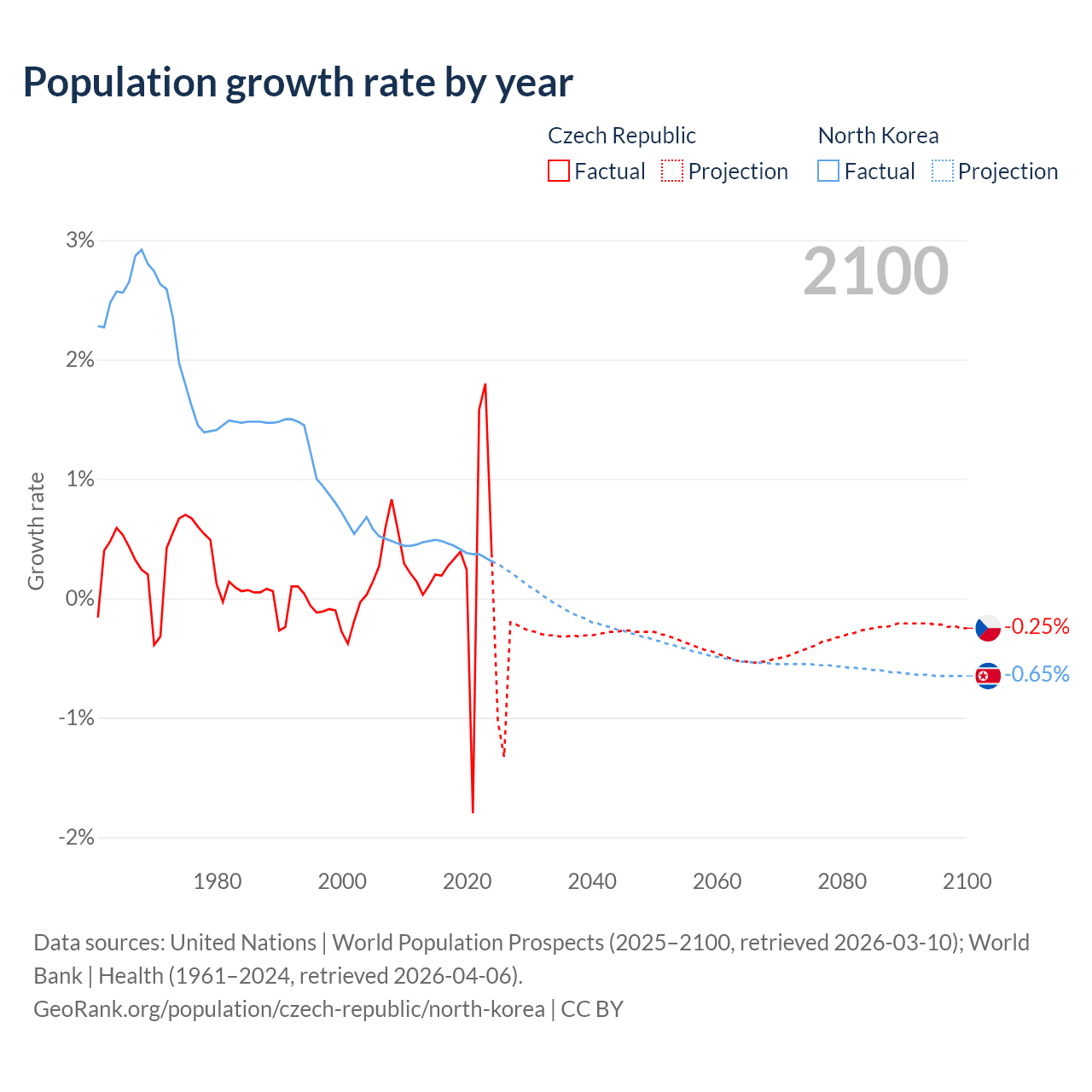- For the last 10 years, the Czech Republic has had an average growth rate of +0.34% per year vs +0.41% in North Korea.