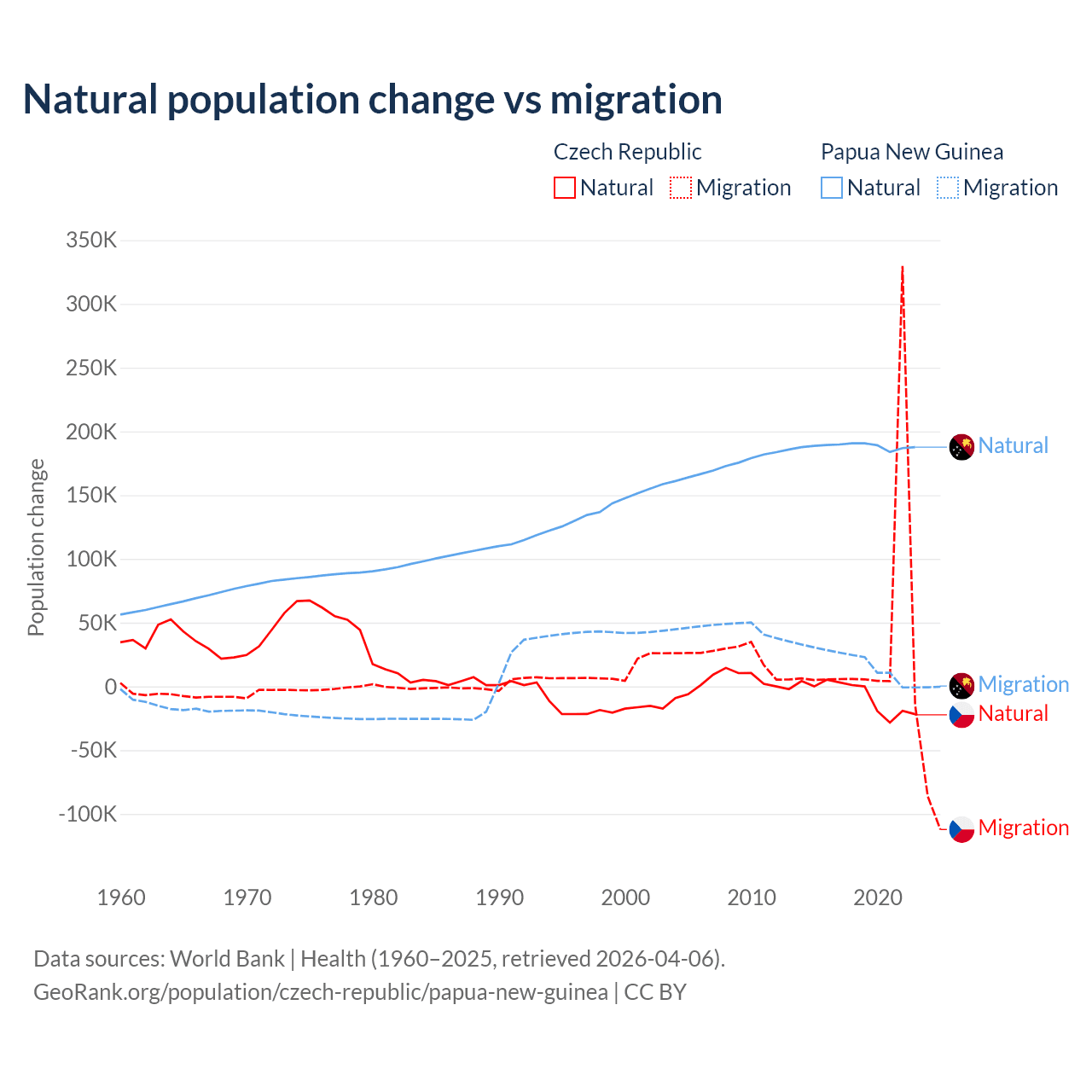 Over the last 10 years, 17.3% of the population change in the Czech Republic is from natural causes (a loss of 74,826 people) and 82.7% is from migration (a gain of 357,502 people). In Papua New Guinea 91% is from natural causes (a gain of 1,883,906 people) and 8.98% is from migration (a gain of 185,900 people).
