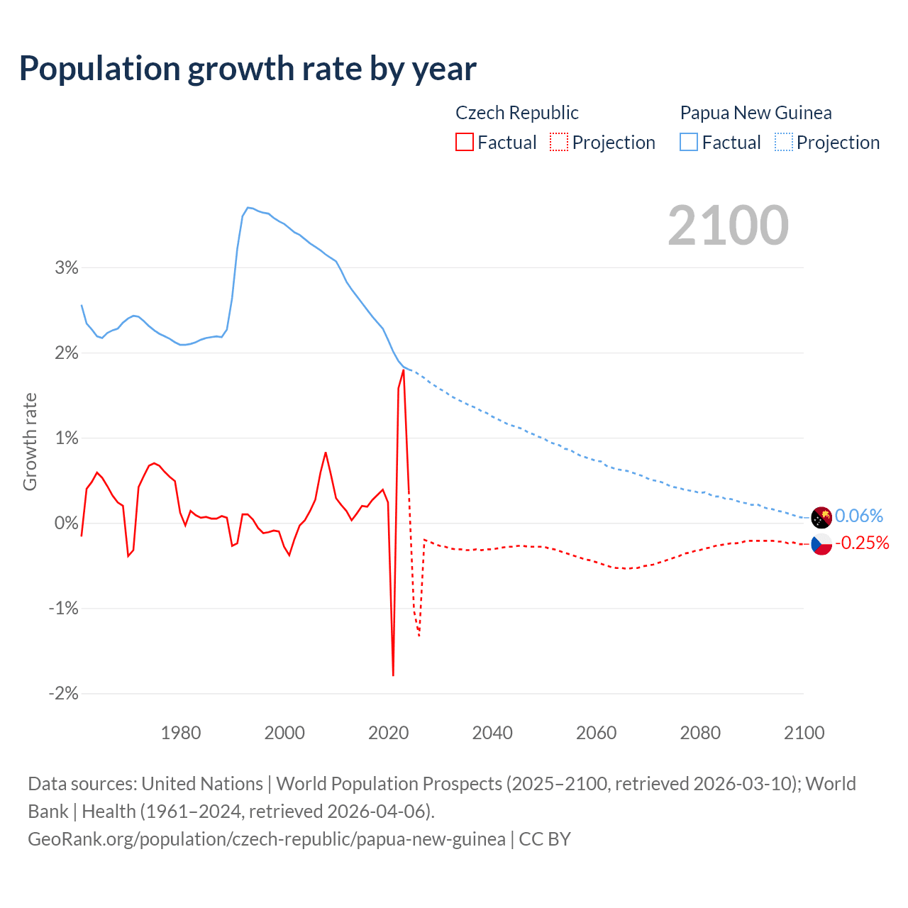 - For the last 10 years, the Czech Republic has had an average growth rate of +0.34% per year vs +2.23% in Papua New Guinea.