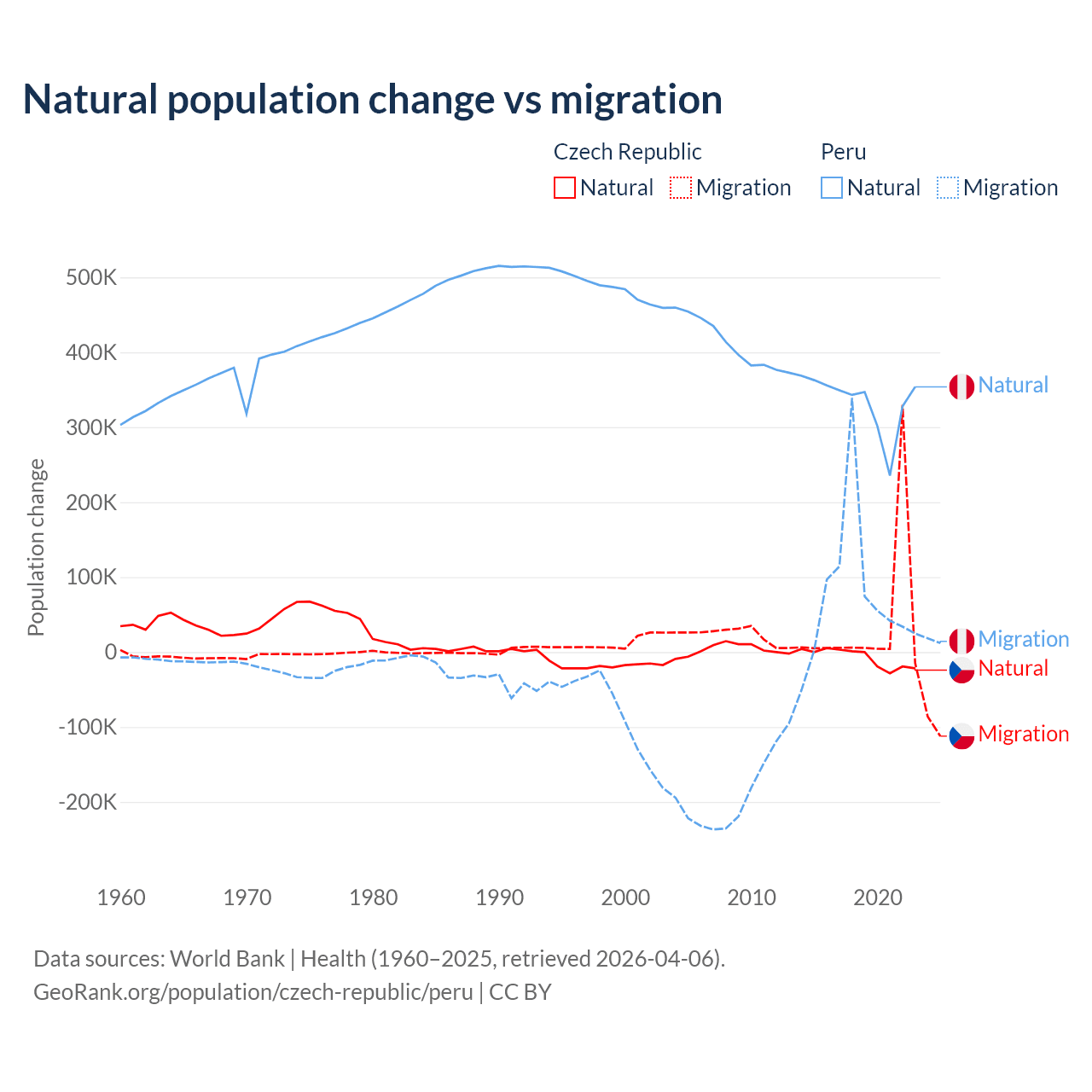 Over the last 10 years, 17.3% of the population change in the Czech Republic is from natural causes (a loss of 74,826 people) and 82.7% is from migration (a gain of 357,502 people). In Peru 82% is from natural causes (a gain of 3,345,822 people) and 18% is from migration (a gain of 732,505 people).