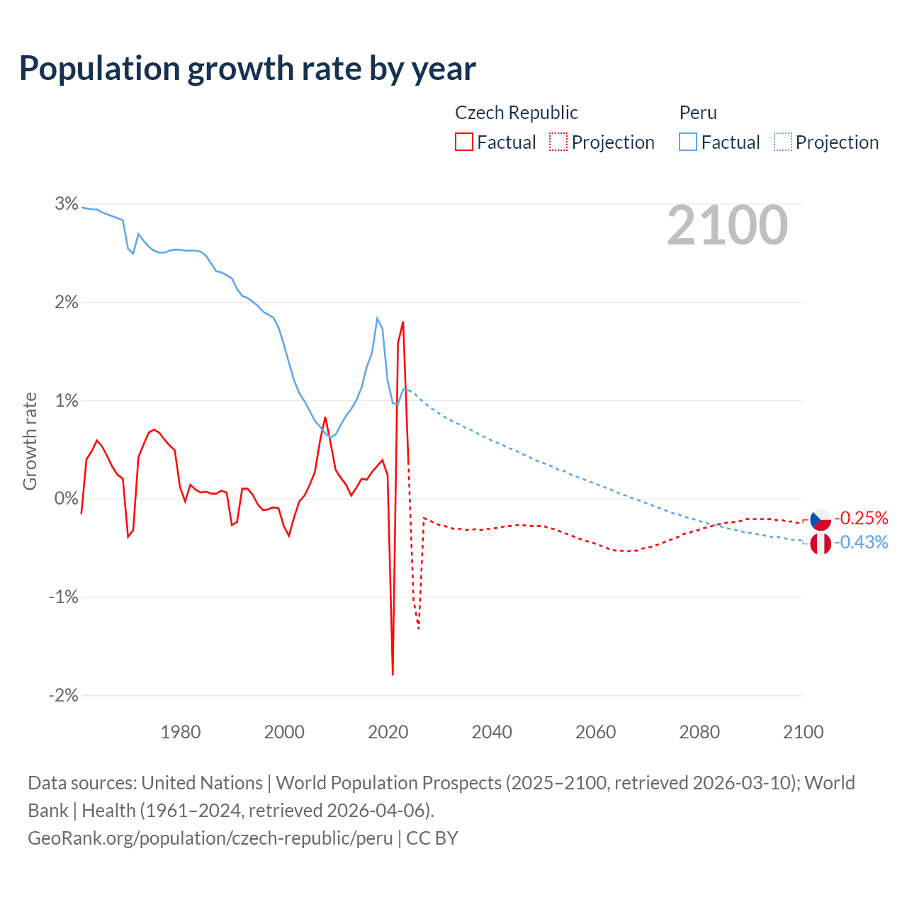 - For the last 10 years, the Czech Republic has had an average growth rate of +0.34% per year vs +1.26% in Peru.