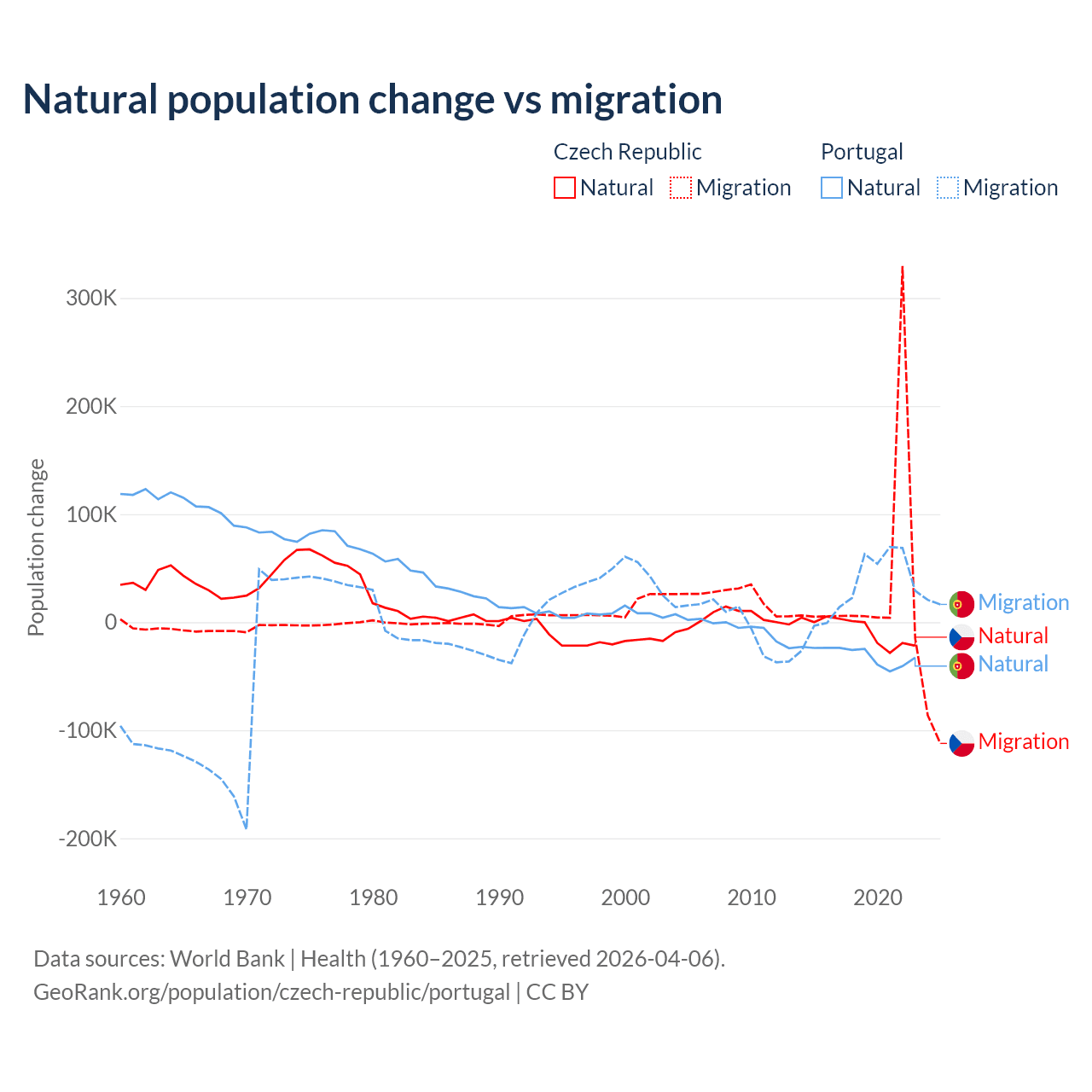 Over the last 10 years, 17.3% of the population change in the Czech Republic is from natural causes (a loss of 74,826 people) and 82.7% is from migration (a gain of 357,502 people). In Portugal 51% is from natural causes (a loss of 302,748 people) and 49% is from migration (a gain of 290,554 people).
