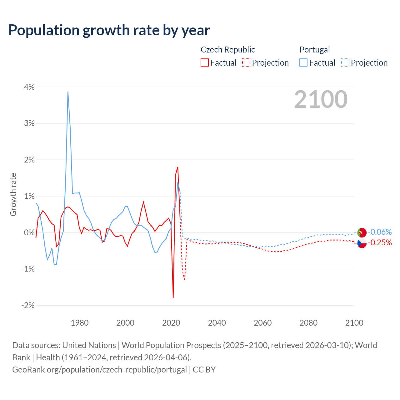 Data sources: World Bank | Health (1960–2024, retrieved 2026-04-06); United Nations | World Population Prospects (1960–2026, retrieved 2026-03-10); U.S. Census Bureau (1960–2025, retrieved 2026-02-08); Central Intelligence Agency (CIA) (2000–2019, retrieved 2026-02-20).