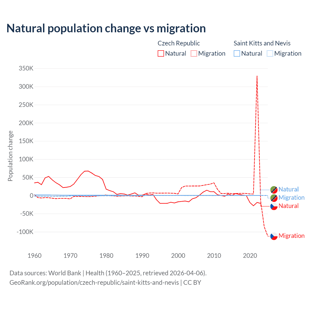 Over the last 10 years, 17.3% of the population change in the Czech Republic is from natural causes (a loss of 74,826 people) and 82.7% is from migration (a gain of 357,502 people). In Saint Kitts and Nevis 44.9% is from natural causes (a gain of 1,225 people) and 55.1% is from migration (a loss of 1,506 people).
