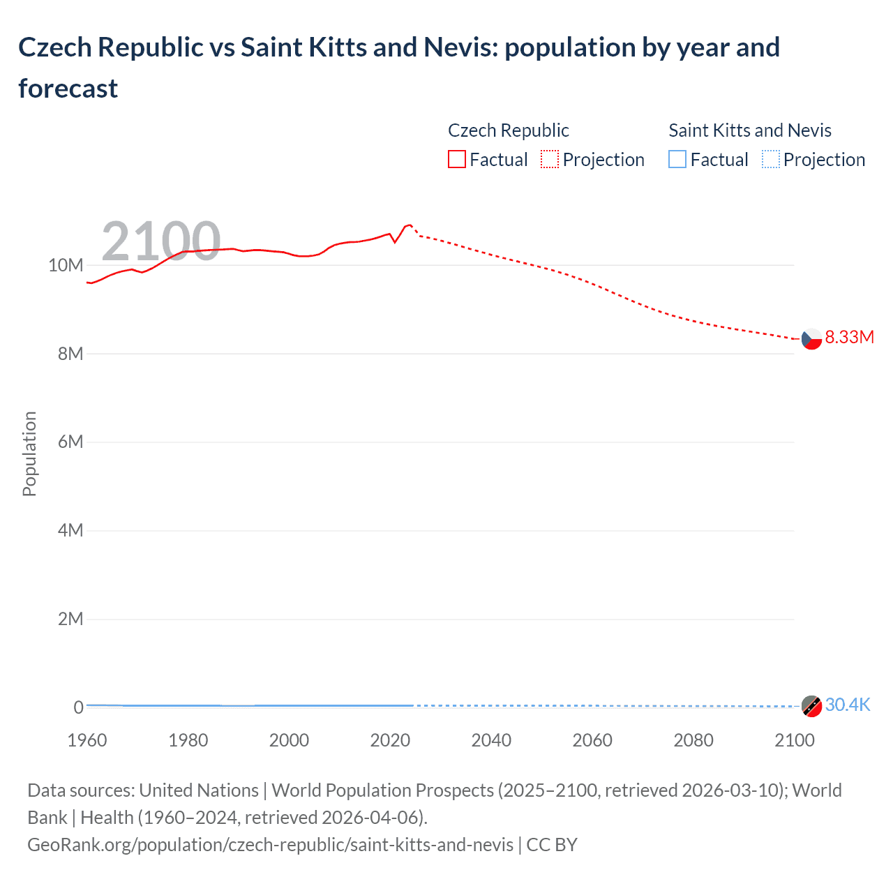The latest officially reported population of the Czech Republic was 10,905,028 in 2024 vs 46,843 people in Saint Kitts and Nevis in 2024. In 2026, based on the adjusted UN estimation, the current Czech Republic's population is 10,649,126 people compared to 47,017 in Saint Kitts and Nevis.