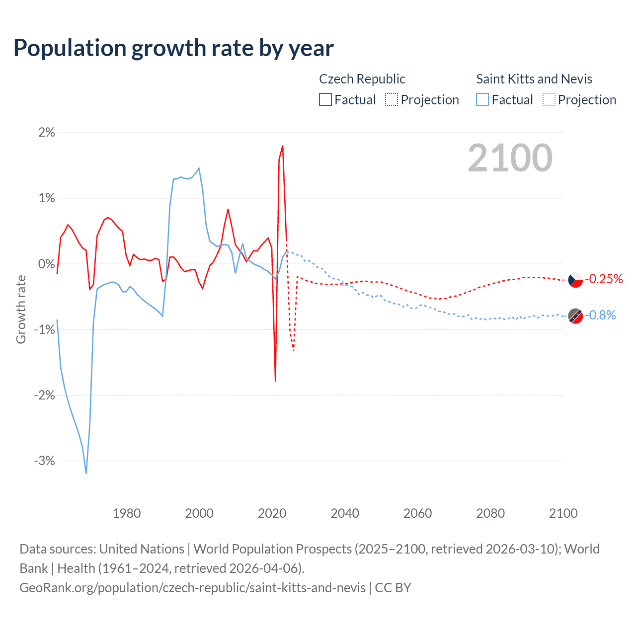 - For the last 10 years, the Czech Republic has had an average growth rate of +0.34% per year vs -0.04% in Saint Kitts and Nevis.
