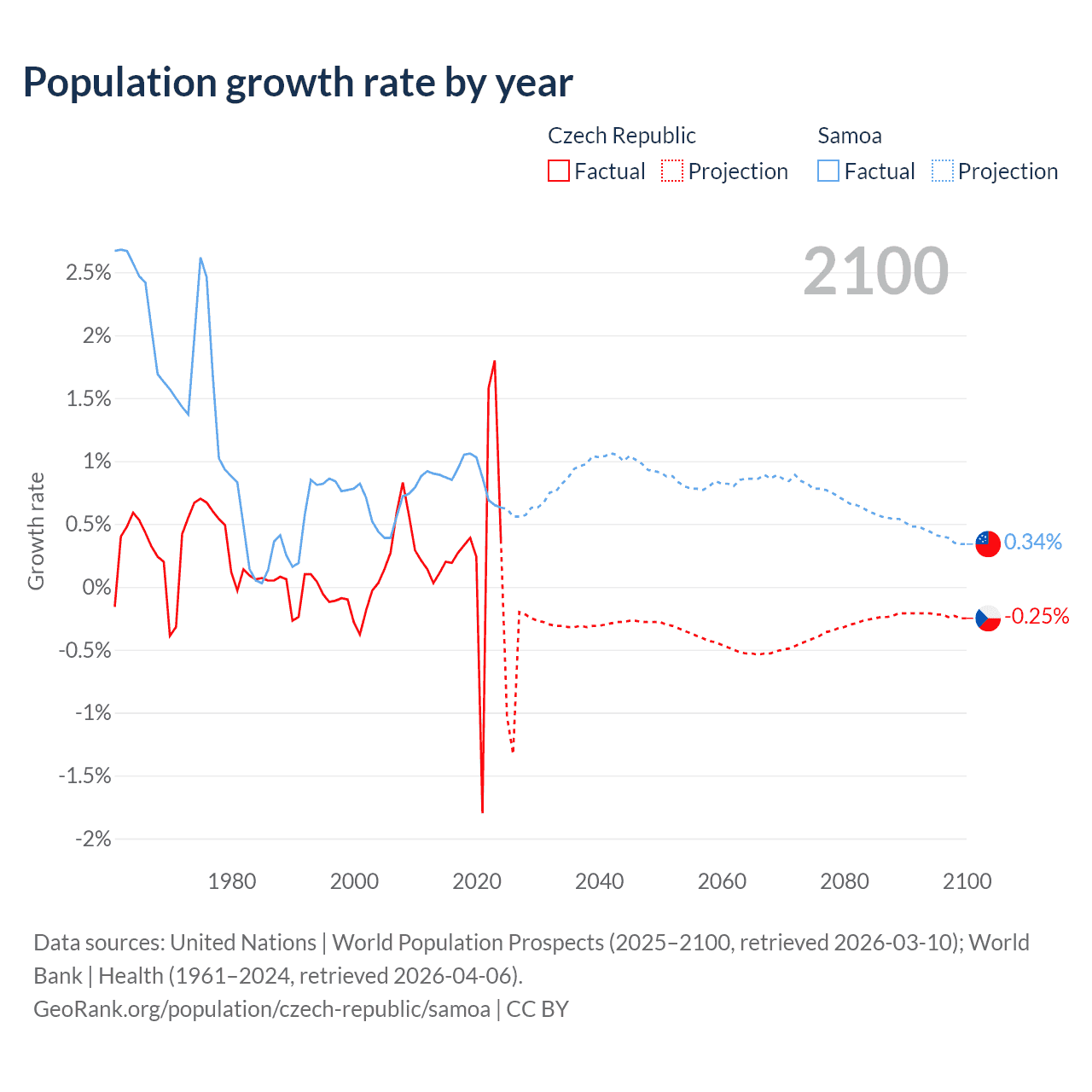 - For the last 10 years, the Czech Republic has had an average growth rate of +0.34% per year vs +0.87% in Samoa.