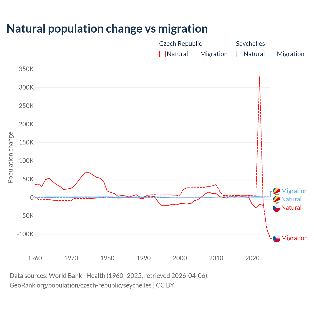 Over the last 10 years, 17.3% of the population change in the Czech Republic is from natural causes (a loss of 74,826 people) and 82.7% is from migration (a gain of 357,502 people). In the Seychelles 31.4% is from natural causes (a gain of 8,122 people) and 68.6% is from migration (a gain of 17,748 people).