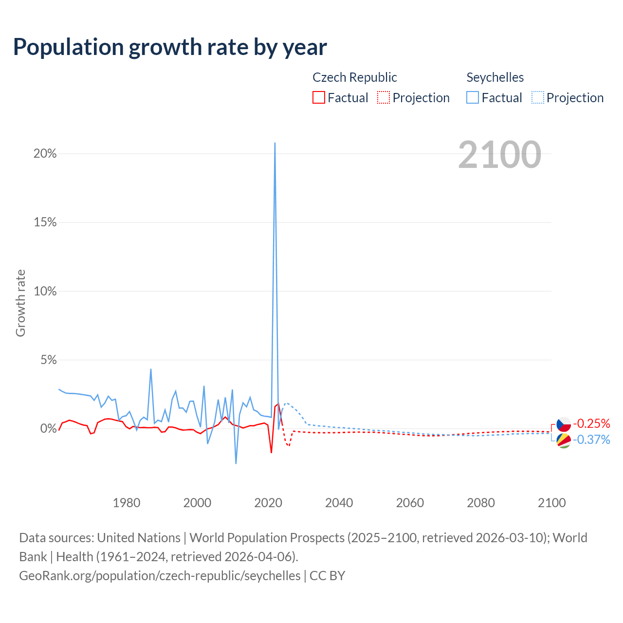 - For the last 10 years, the Czech Republic has had an average growth rate of +0.34% per year vs +2.9% in the Seychelles.