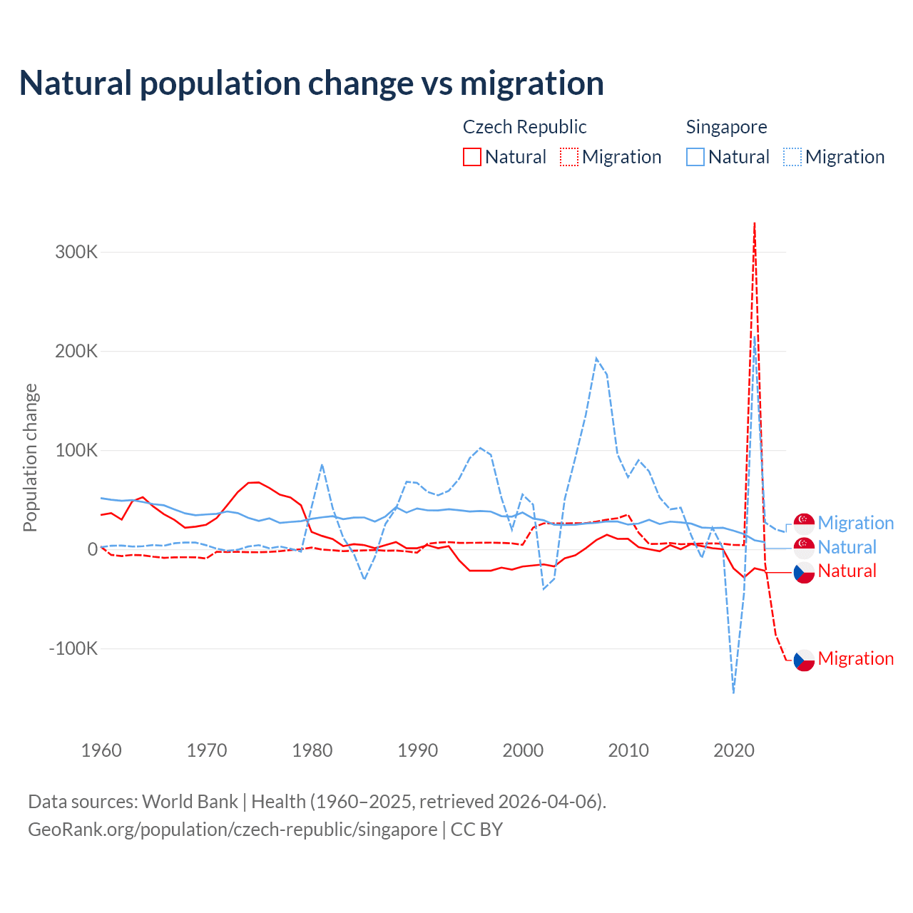 Over the last 10 years, 17.3% of the population change in the Czech Republic is from natural causes (a loss of 74,826 people) and 82.7% is from migration (a gain of 357,502 people). In Singapore 54.8% is from natural causes (a gain of 195,953 people) and 45.2% is from migration (a gain of 161,805 people).