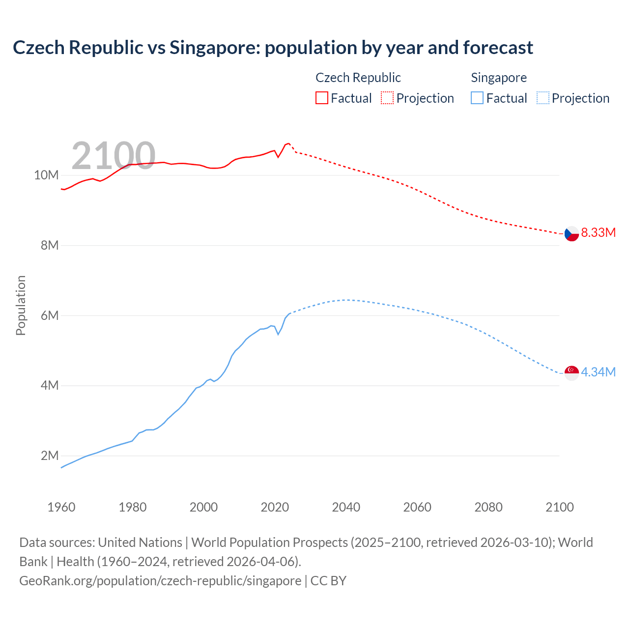 The latest officially reported population of the Czech Republic was 10,905,028 in 2024 vs 6,036,860 people in Singapore in 2024. In 2026, based on the adjusted UN estimation, the current Czech Republic's population is 10,649,126 people compared to 6,125,852 in Singapore.