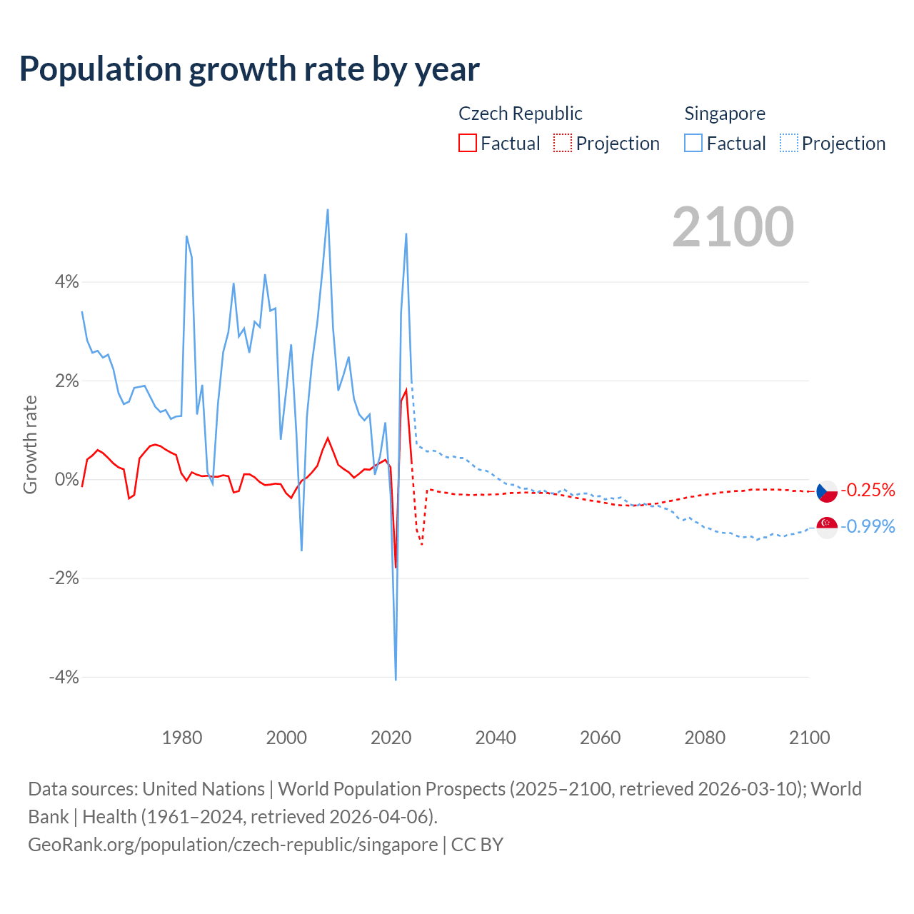 - For the last 10 years, the Czech Republic has had an average growth rate of +0.34% per year vs +1.04% in Singapore.
