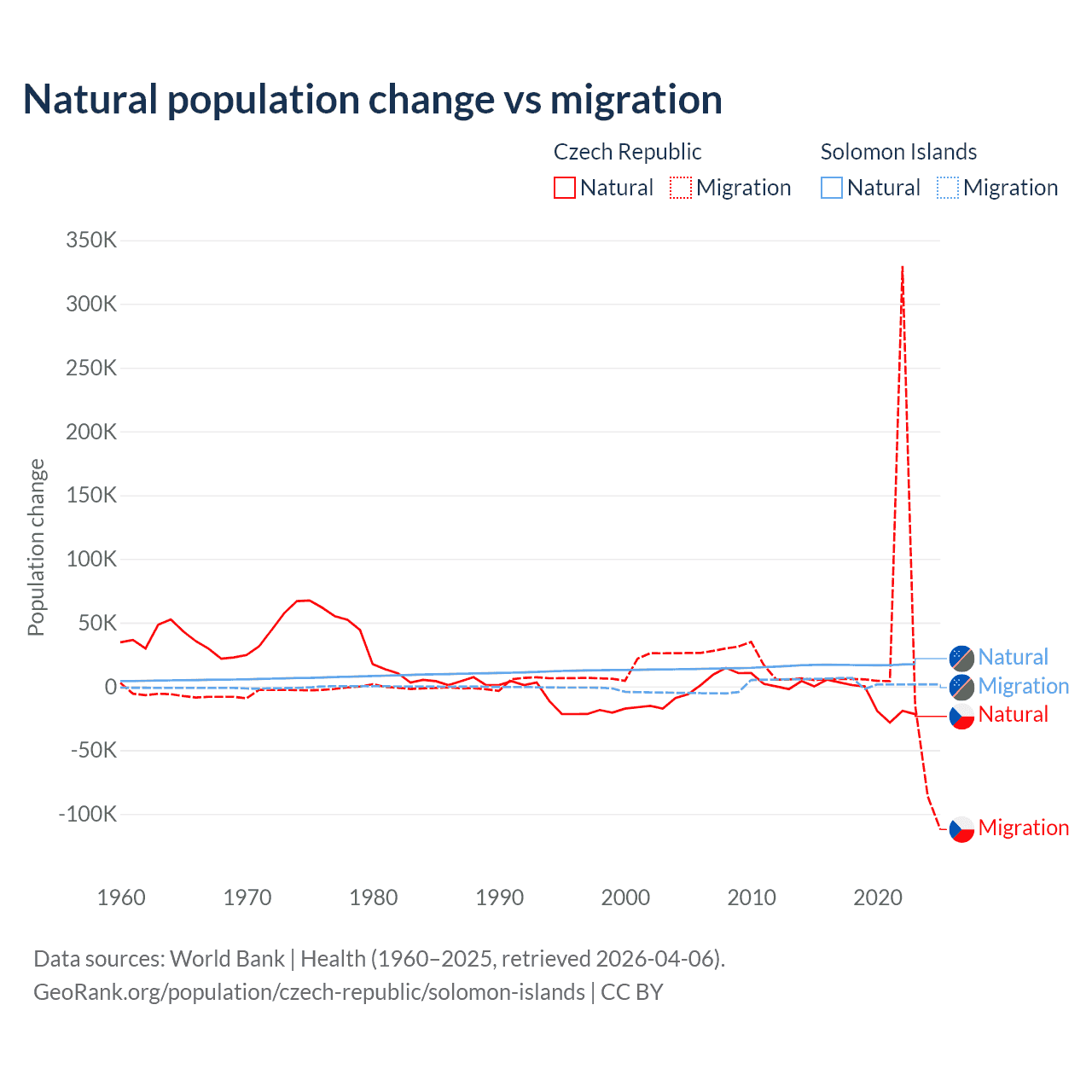 Over the last 10 years, 17.3% of the population change in the Czech Republic is from natural causes (a loss of 74,826 people) and 82.7% is from migration (a gain of 357,502 people). In the Solomon Islands 82.8% is from natural causes (a gain of 168,727 people) and 17.2% is from migration (a gain of 35,031 people).
