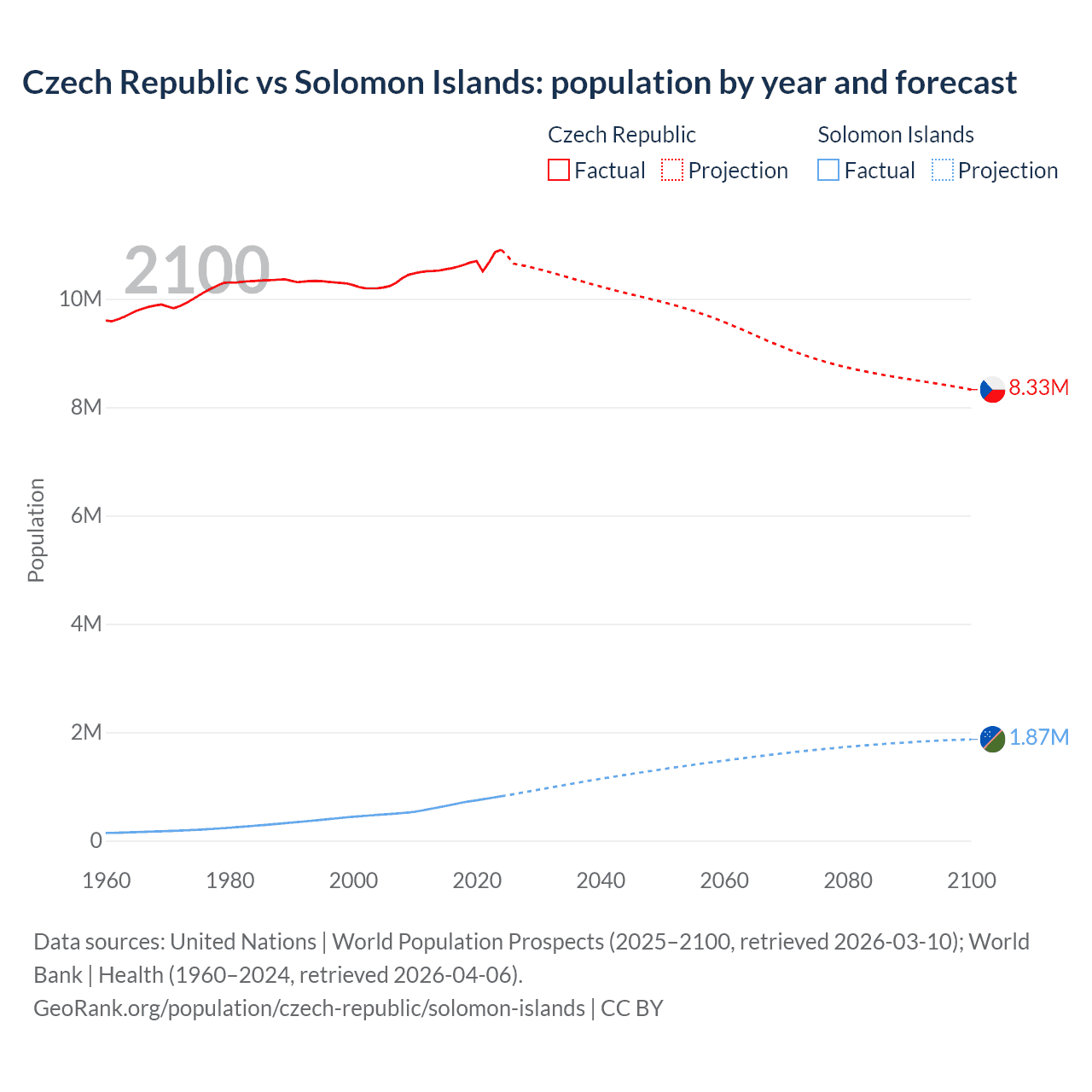 Czech Republic vs Solomon Islands: population by year and forecast
