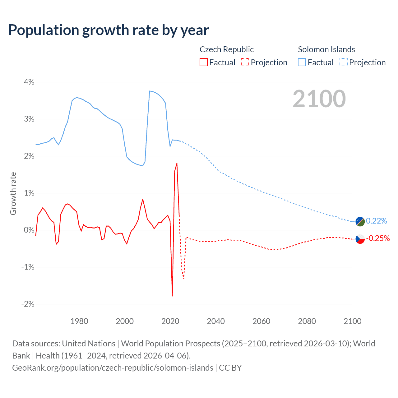 - For the last 10 years, the Czech Republic has had an average growth rate of +0.34% per year vs +2.95% in the Solomon Islands.