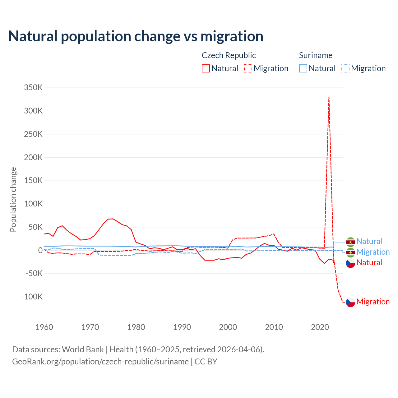 Over the last 10 years, 17.3% of the population change in the Czech Republic is from natural causes (a loss of 74,826 people) and 82.7% is from migration (a gain of 357,502 people). In Suriname 90.3% is from natural causes (a gain of 66,709 people) and 9.72% is from migration (a loss of 7,185 people).