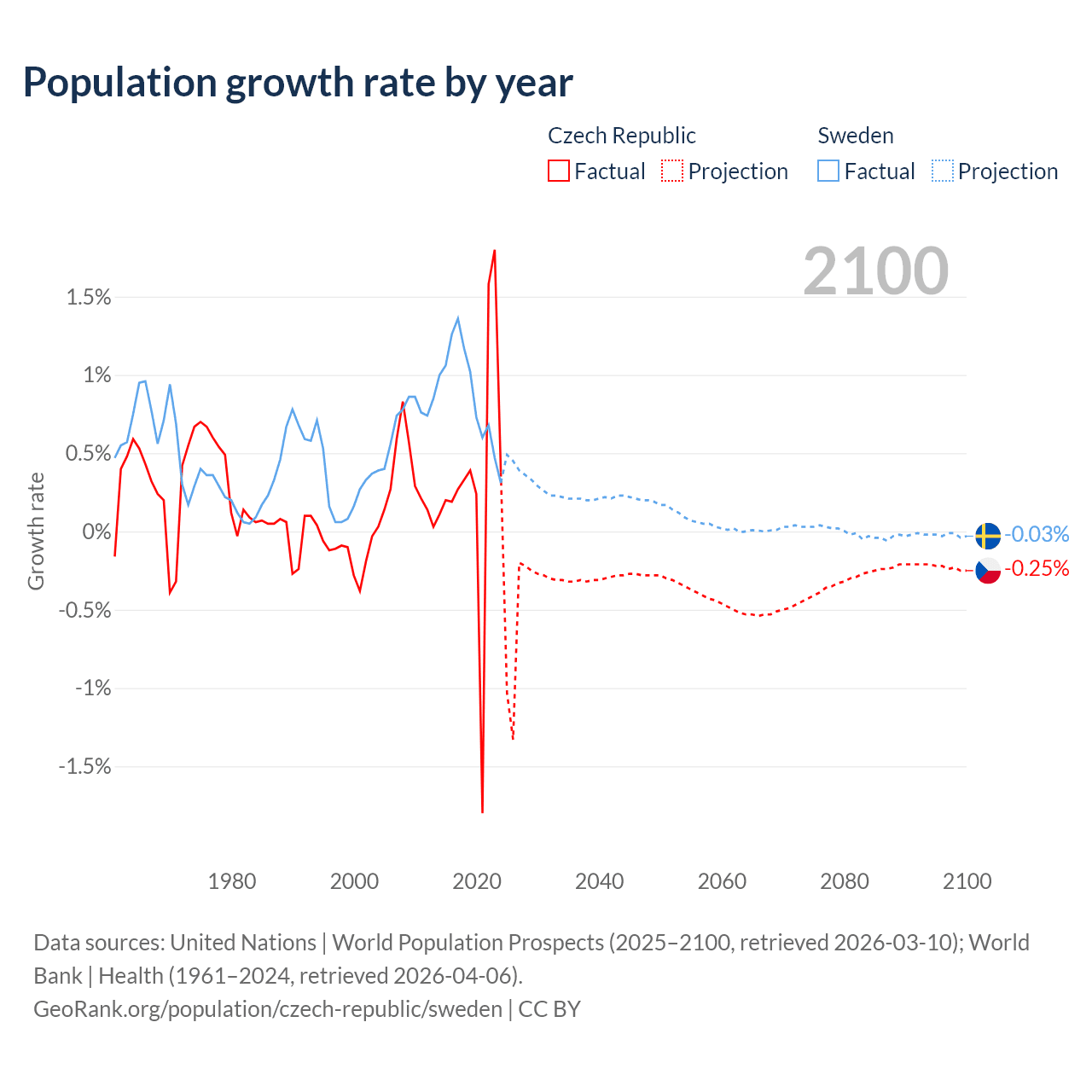 - For the last 10 years, the Czech Republic has had an average growth rate of +0.34% per year vs +0.88% in Sweden.