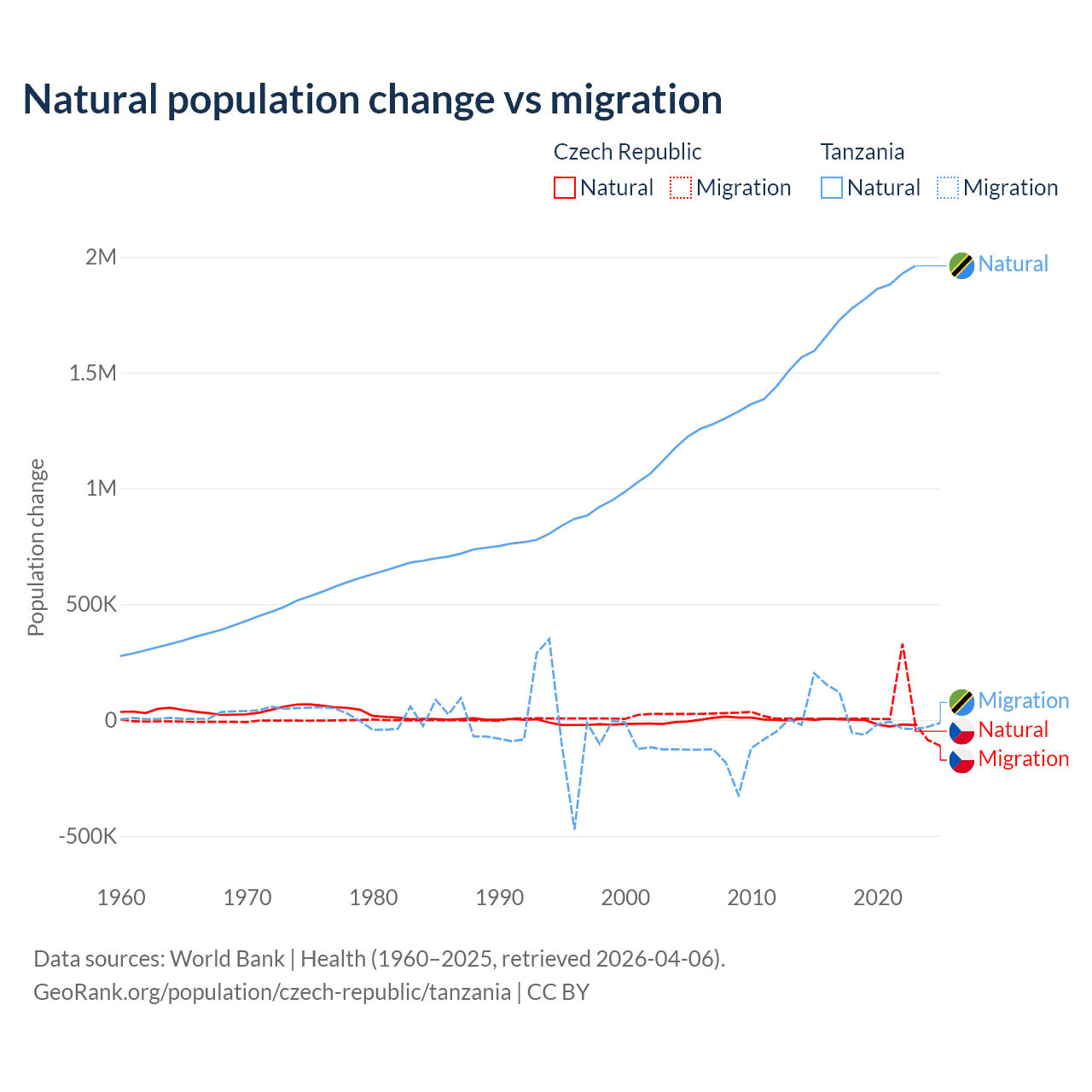 Over the last 10 years, 17.3% of the population change in the Czech Republic is from natural causes (a loss of 74,826 people) and 82.7% is from migration (a gain of 357,502 people). In Tanzania 98.7% is from natural causes (a gain of 17,769,541 people) and 1.27% is from migration (a gain of 229,466 people).
