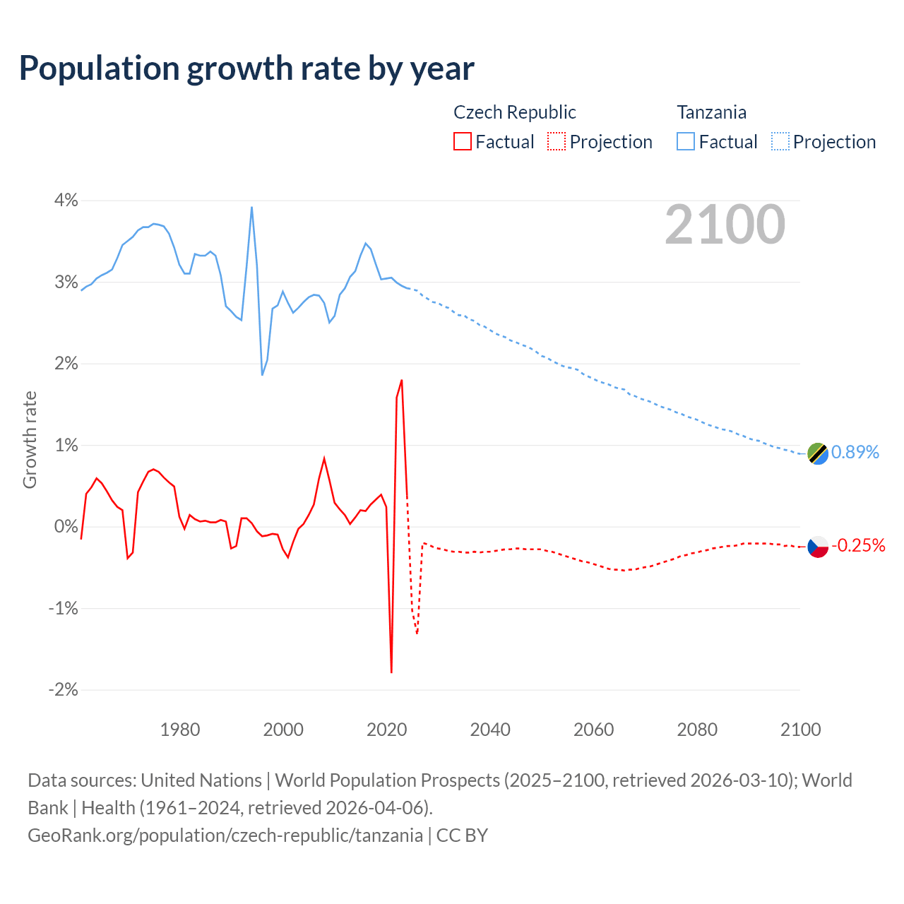 - For the last 10 years, the Czech Republic has had an average growth rate of +0.34% per year vs +3.13% in Tanzania.