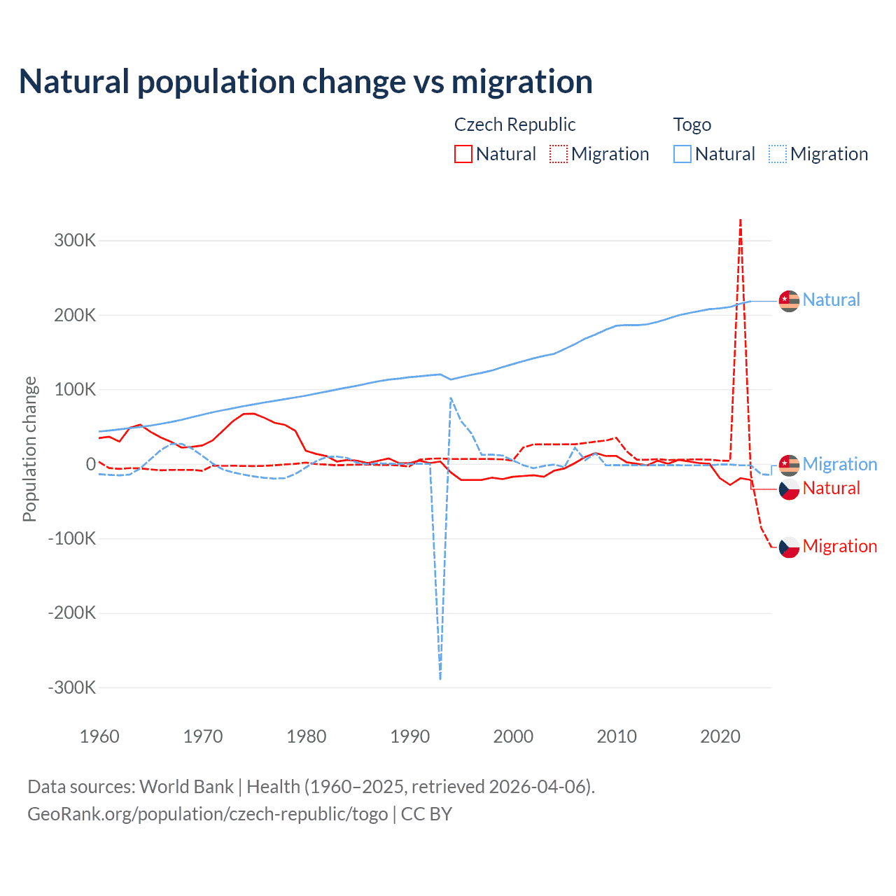 Over the last 10 years, 17.3% of the population change in the Czech Republic is from natural causes (a loss of 74,826 people) and 82.7% is from migration (a gain of 357,502 people). In Togo 99.1% is from natural causes (a gain of 2,052,115 people) and 0.86% is from migration (a loss of 17,852 people).
