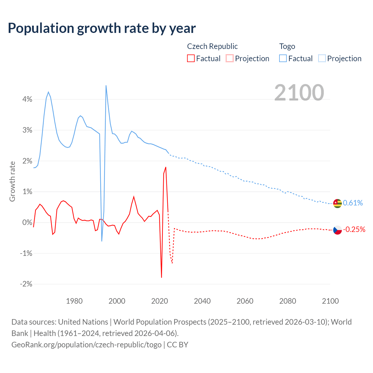 - For the last 10 years, the Czech Republic has had an average growth rate of +0.34% per year vs +2.46% in Togo.