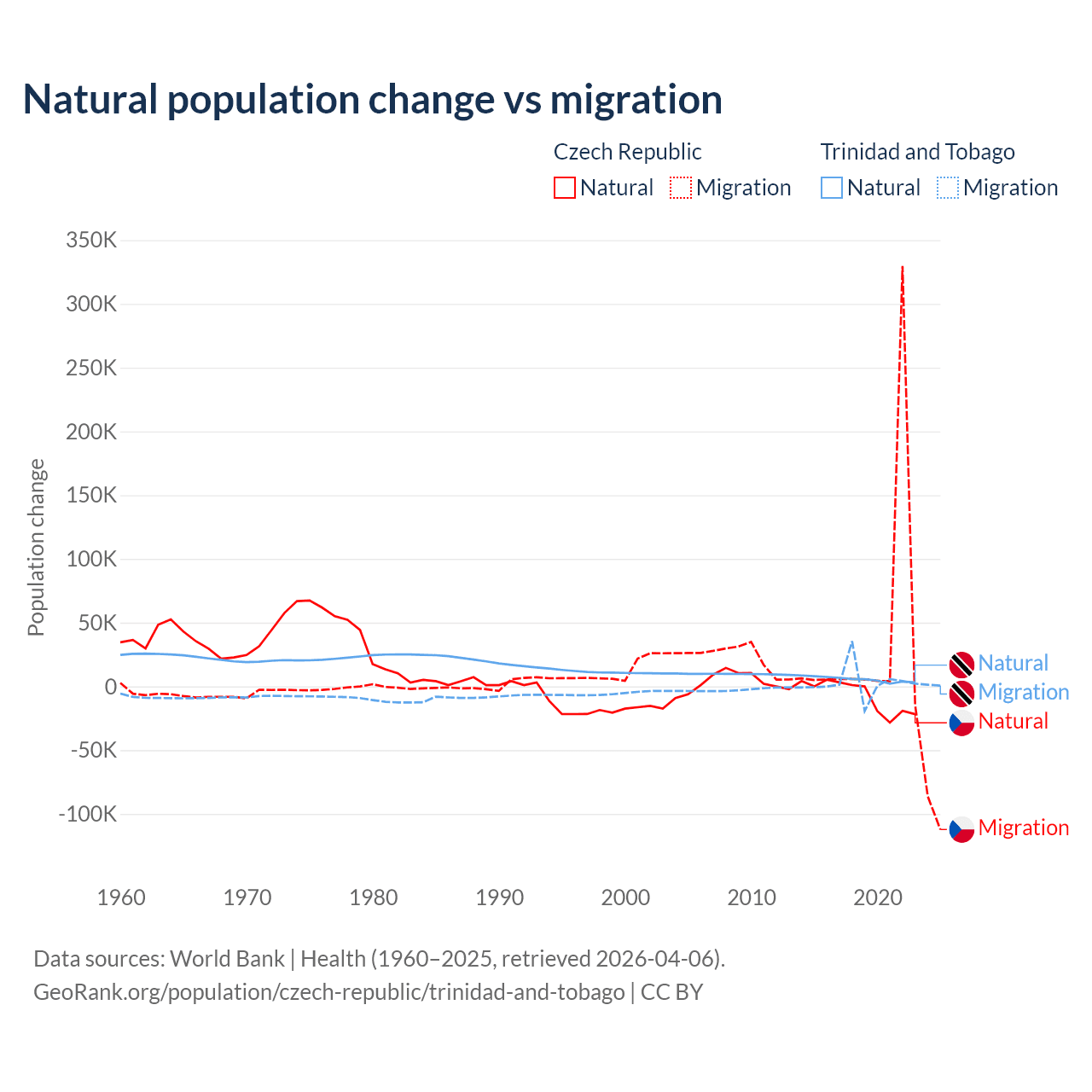 Over the last 10 years, 17.3% of the population change in the Czech Republic is from natural causes (a loss of 74,826 people) and 82.7% is from migration (a gain of 357,502 people). In Trinidad and Tobago 66% is from natural causes (a gain of 55,887 people) and 34% is from migration (a gain of 28,785 people).