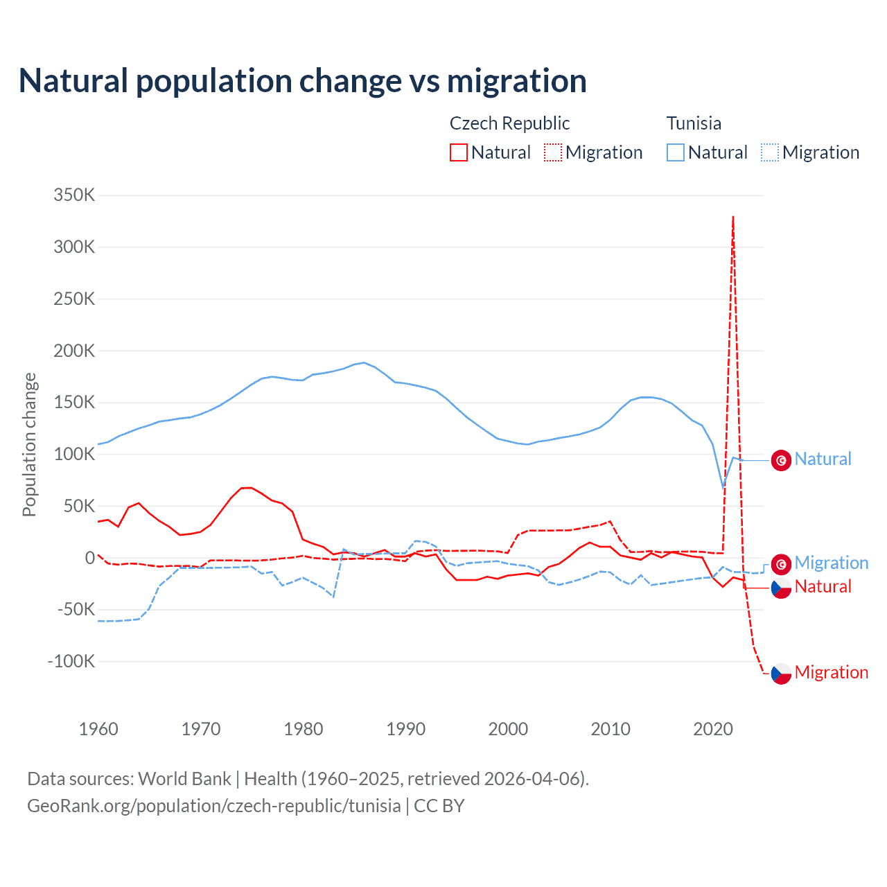 Over the last 10 years, 17.3% of the population change in the Czech Republic is from natural causes (a loss of 74,826 people) and 82.7% is from migration (a gain of 357,502 people). In Tunisia 86.3% is from natural causes (a gain of 1,225,079 people) and 13.7% is from migration (a loss of 195,011 people).