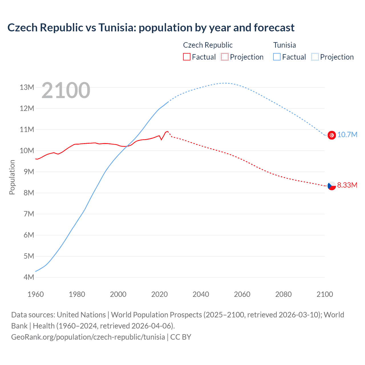The latest officially reported population of the Czech Republic was 10,905,028 in 2024 vs 12,277,109 people in Tunisia in 2024. In 2026, based on the adjusted UN estimation, the current Czech Republic's population is 10,649,126 people compared to 12,437,803 in Tunisia.