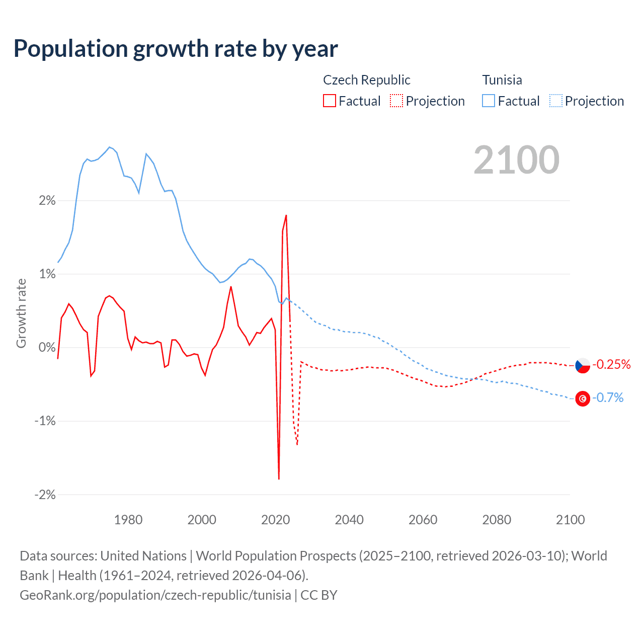 - For the last 10 years, the Czech Republic has had an average growth rate of +0.34% per year vs +0.89% in Tunisia.