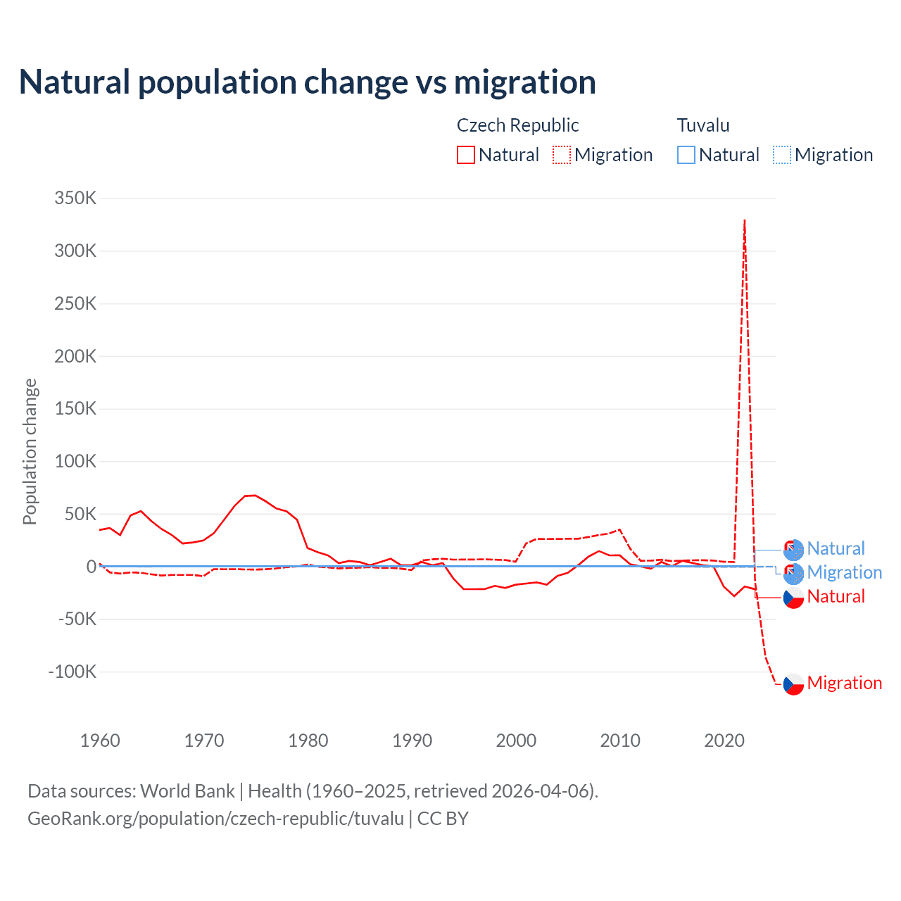 Over the last 10 years, 17.3% of the population change in the Czech Republic is from natural causes (a loss of 74,826 people) and 82.7% is from migration (a gain of 357,502 people). In Tuvalu 35.5% is from natural causes (a gain of 1,556 people) and 64.5% is from migration (a loss of 2,827 people).
