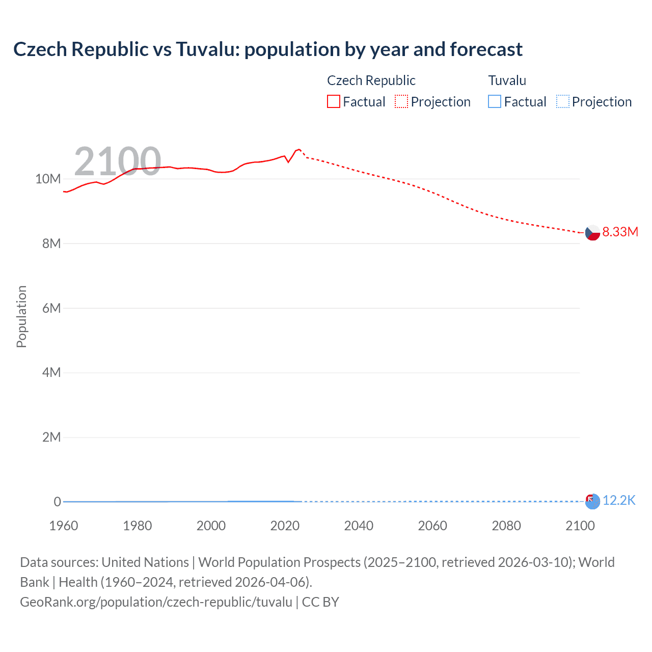 The latest officially reported population of the Czech Republic was 10,905,028 in 2024 vs 9,646 people in Tuvalu in 2024. In 2026, based on the adjusted UN estimation, the current Czech Republic's population is 10,649,126 people compared to 9,341 in Tuvalu.