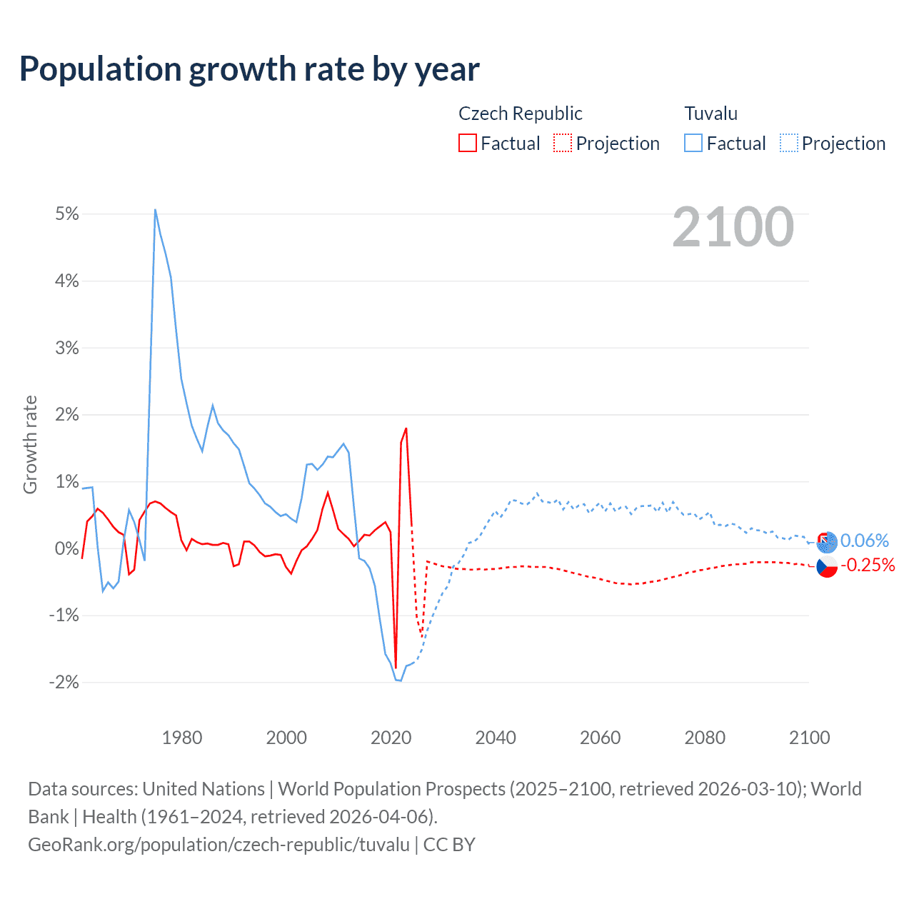 - For the last 10 years, the Czech Republic has had an average growth rate of +0.34% per year vs -1.19% in Tuvalu.