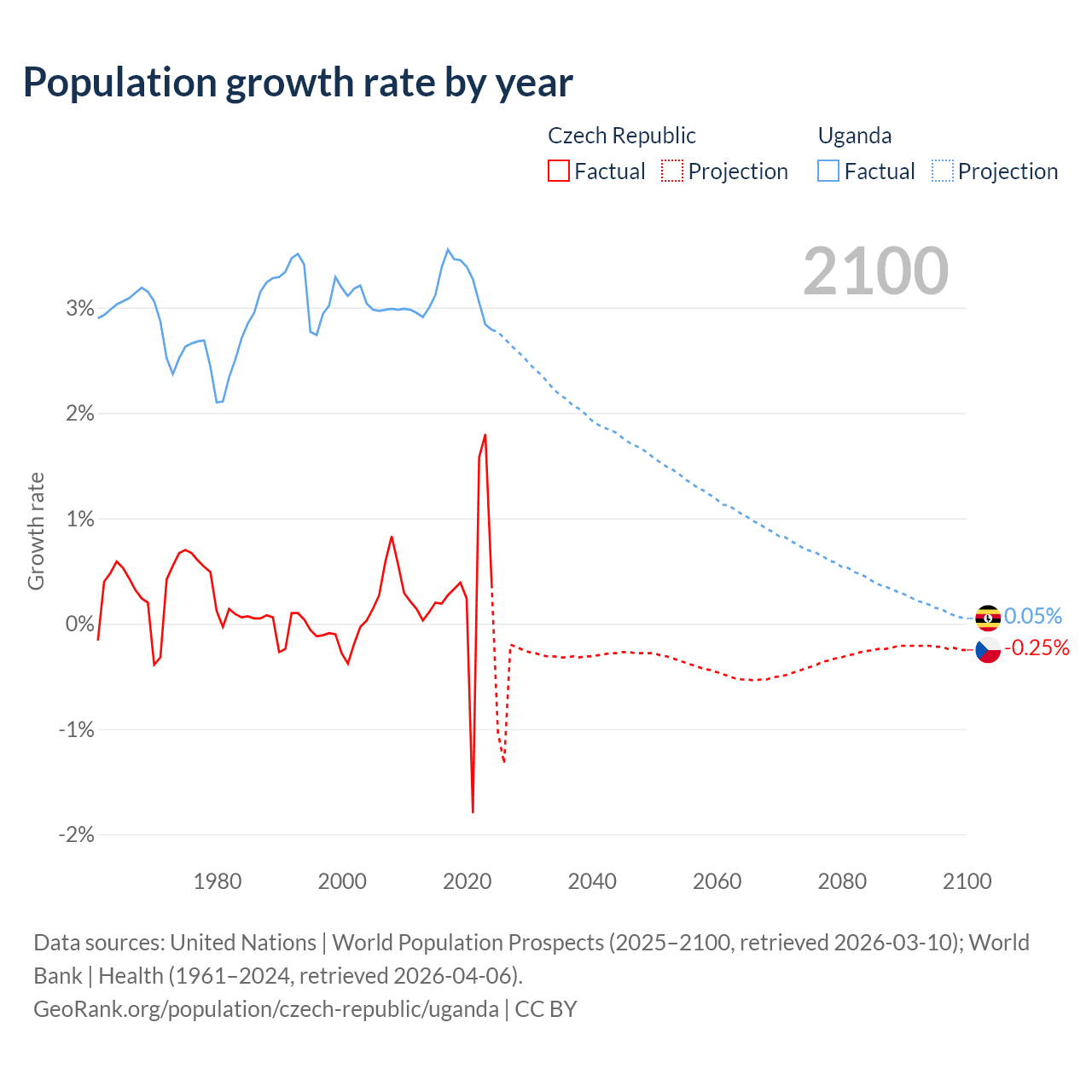 - For the last 10 years, the Czech Republic has had an average growth rate of +0.34% per year vs +3.21% in Uganda.
