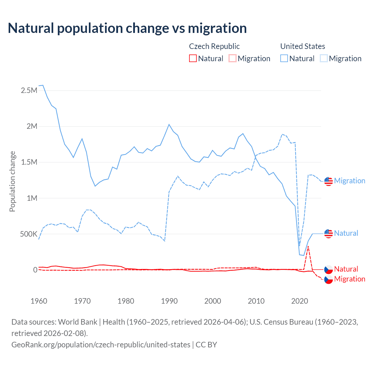 Over the last 10 years, 17.3% of the population change in the Czech Republic is from natural causes (a loss of 74,826 people) and 82.7% is from migration (a gain of 357,502 people). In the United States 35.8% is from natural causes (a gain of 8,005,866 people) and 64.2% is from migration (a gain of 14,334,286 people).