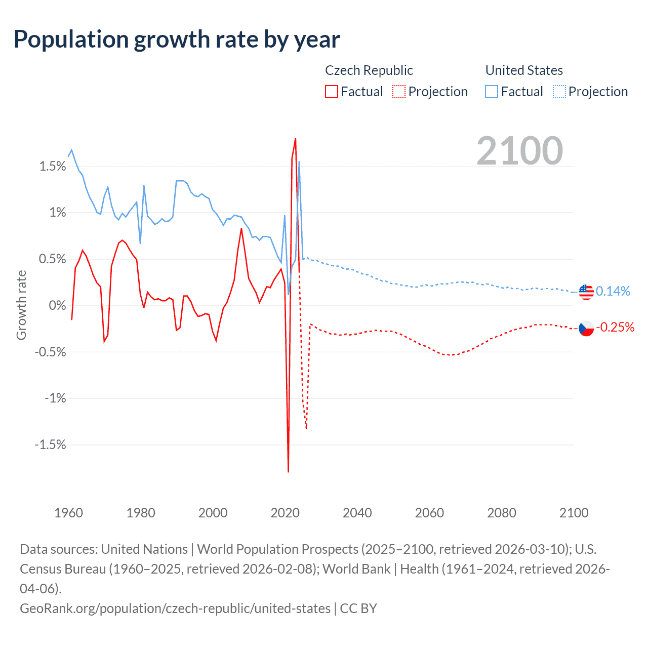 Data sources: World Bank | Health (1960–2024, retrieved 2026-04-06); United Nations | World Population Prospects (1960–2026, retrieved 2026-03-10); U.S. Census Bureau (1960–2025, retrieved 2026-02-08); Central Intelligence Agency (CIA) (2000–2019, retrieved 2026-02-20).