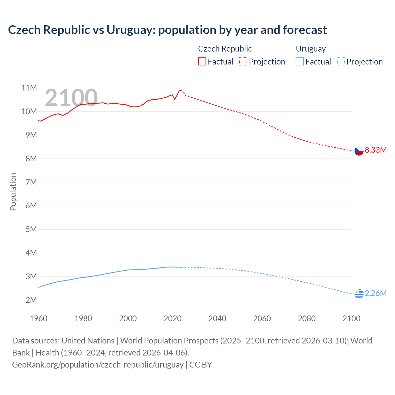 The latest officially reported population of the Czech Republic was 10,905,028 in 2024 vs 3,386,588 people in Uruguay in 2024. In 2026, based on the adjusted UN estimation, the current Czech Republic's population is 10,649,126 people compared to 3,382,789 in Uruguay.