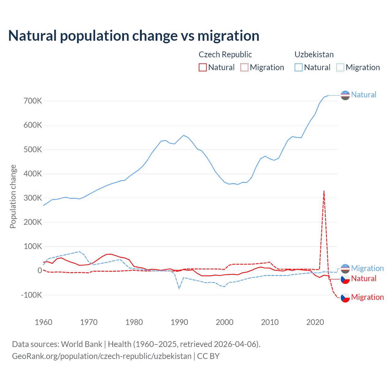 Over the last 10 years, 17.3% of the population change in the Czech Republic is from natural causes (a loss of 74,826 people) and 82.7% is from migration (a gain of 357,502 people). In Uzbekistan 98.2% is from natural causes (a gain of 6,161,117 people) and 1.84% is from migration (a loss of 115,398 people).