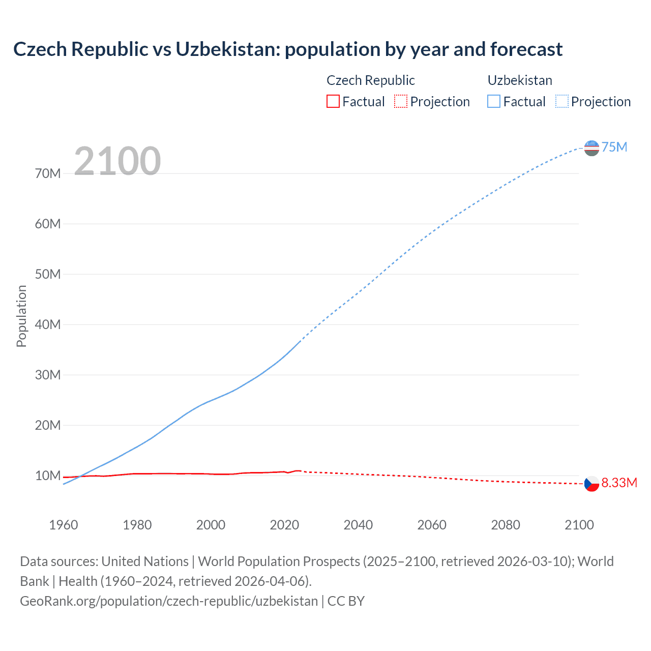 The latest officially reported population of the Czech Republic was 10,905,028 in 2024 vs 36,361,859 people in Uzbekistan in 2024. In 2026, based on the adjusted UN estimation, the current Czech Republic's population is 10,649,126 people compared to 37,939,105 in Uzbekistan.