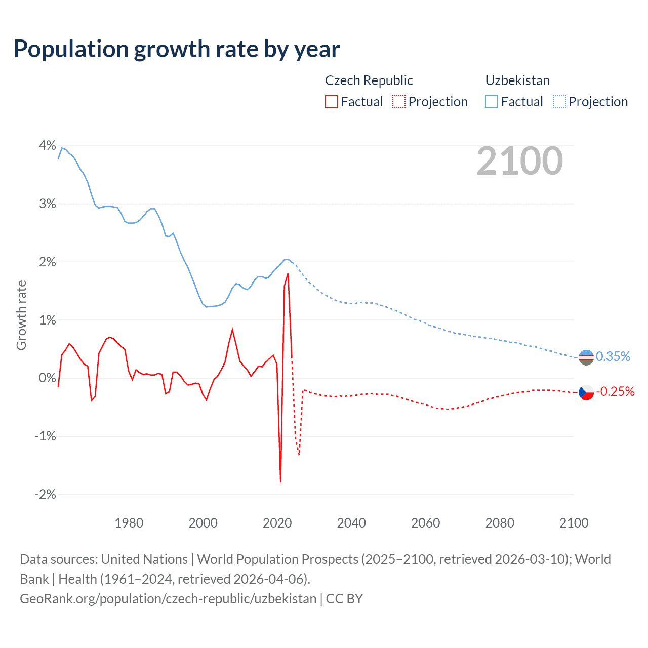 - For the last 10 years, the Czech Republic has had an average growth rate of +0.34% per year vs +1.85% in Uzbekistan.