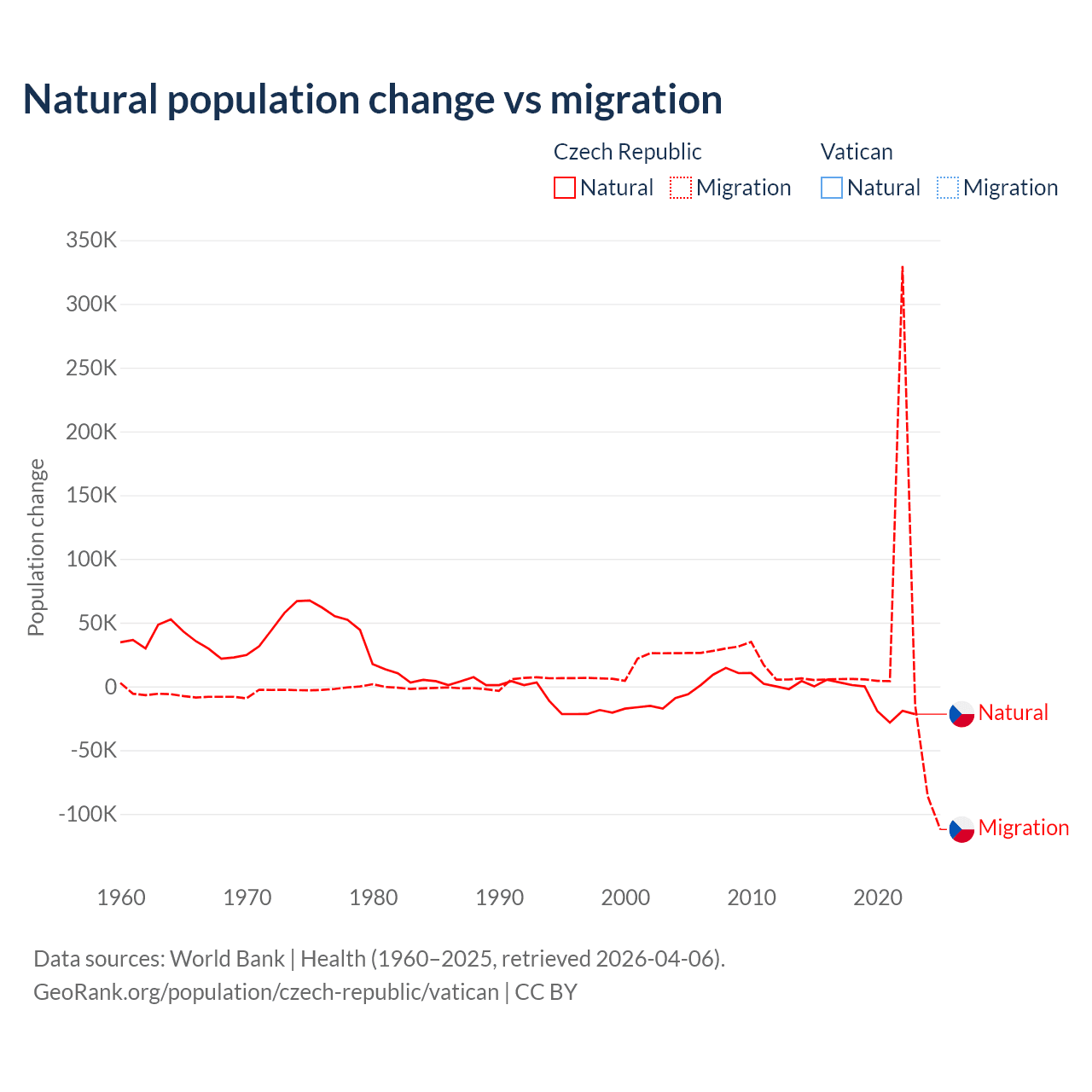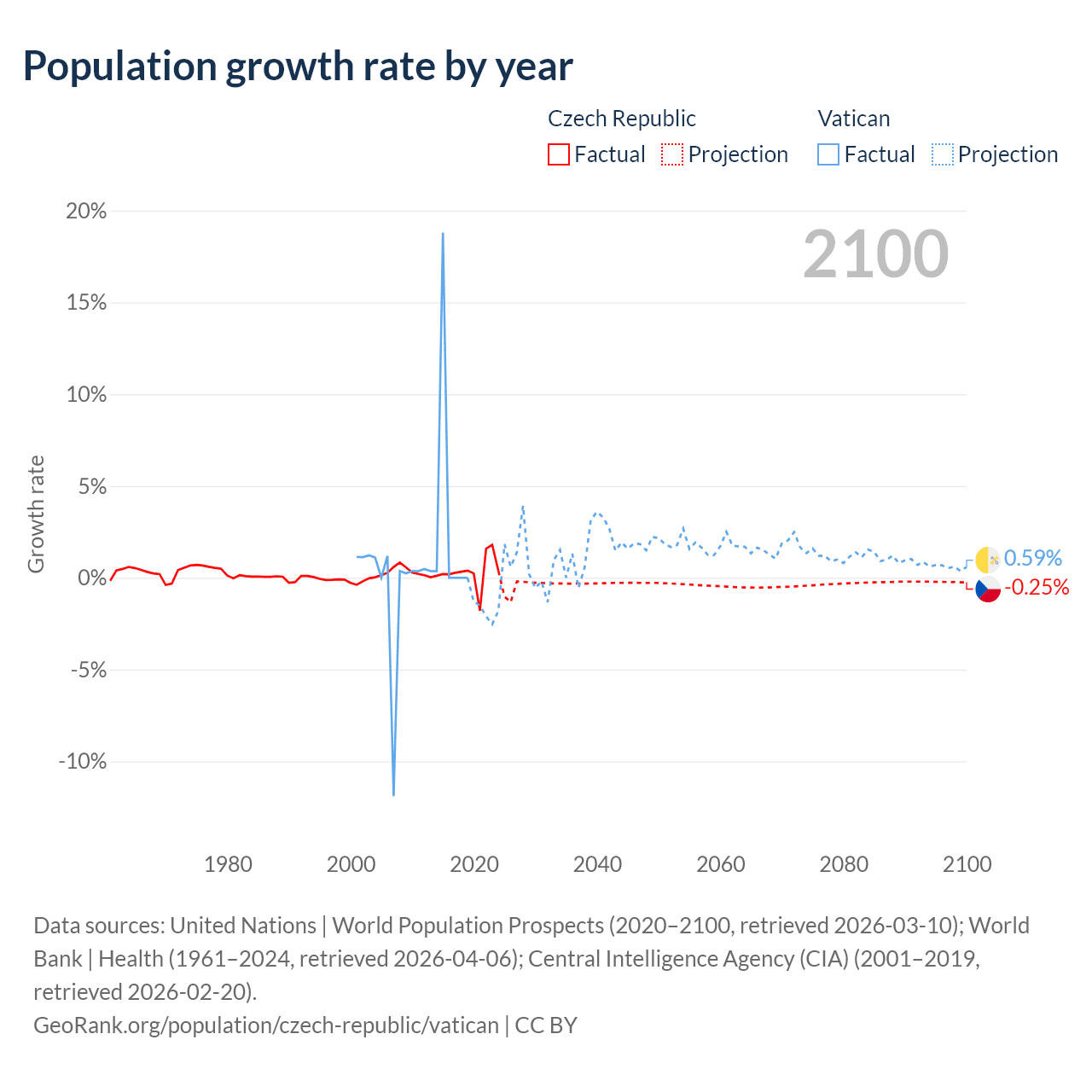 - For the last 10 years, the Czech Republic has had an average growth rate of +0.34% per year vs +1.9% in the Vatican.