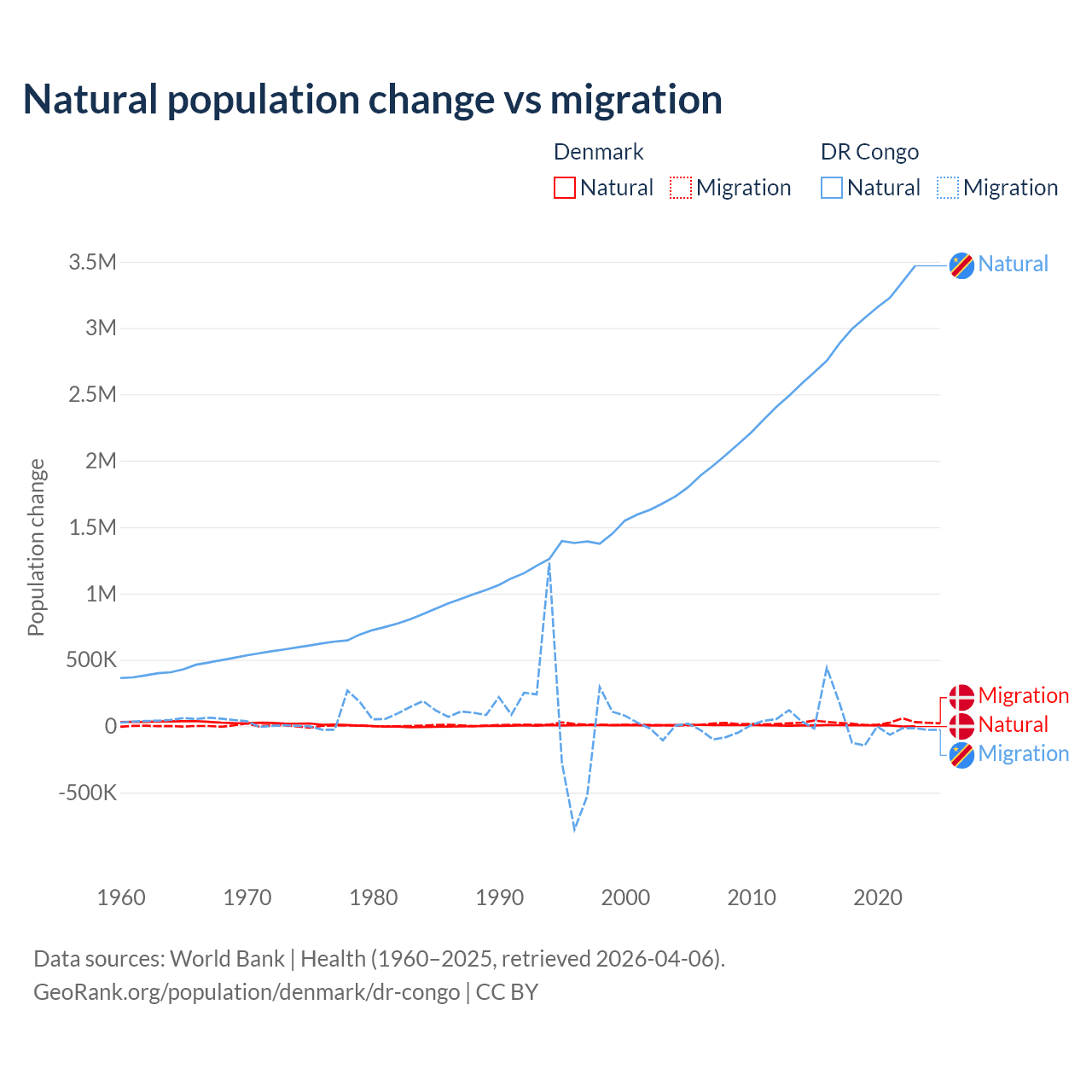 Over the last 10 years, 15.4% of the population change in Denmark is from natural causes (a gain of 51,826 people) and 84.6% is from migration (a gain of 284,848 people). In the DR Congo 99.1% is from natural causes (a gain of 30,150,516 people) and 0.89% is from migration (a gain of 270,872 people).