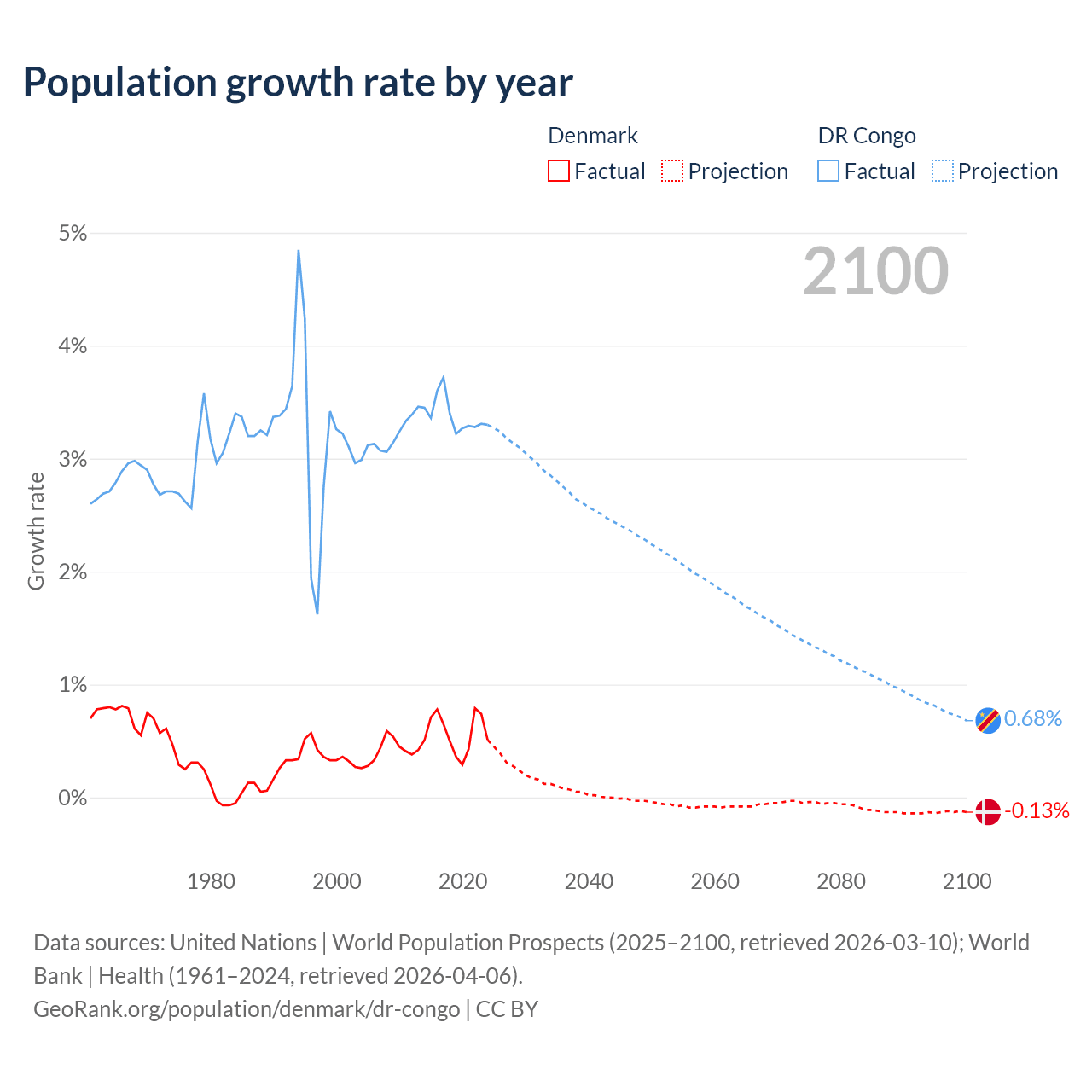 - For the last 10 years, Denmark has had an average growth rate of +0.57% per year vs +3.38% in the DR Congo.